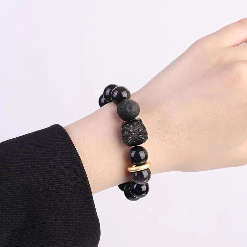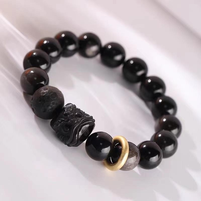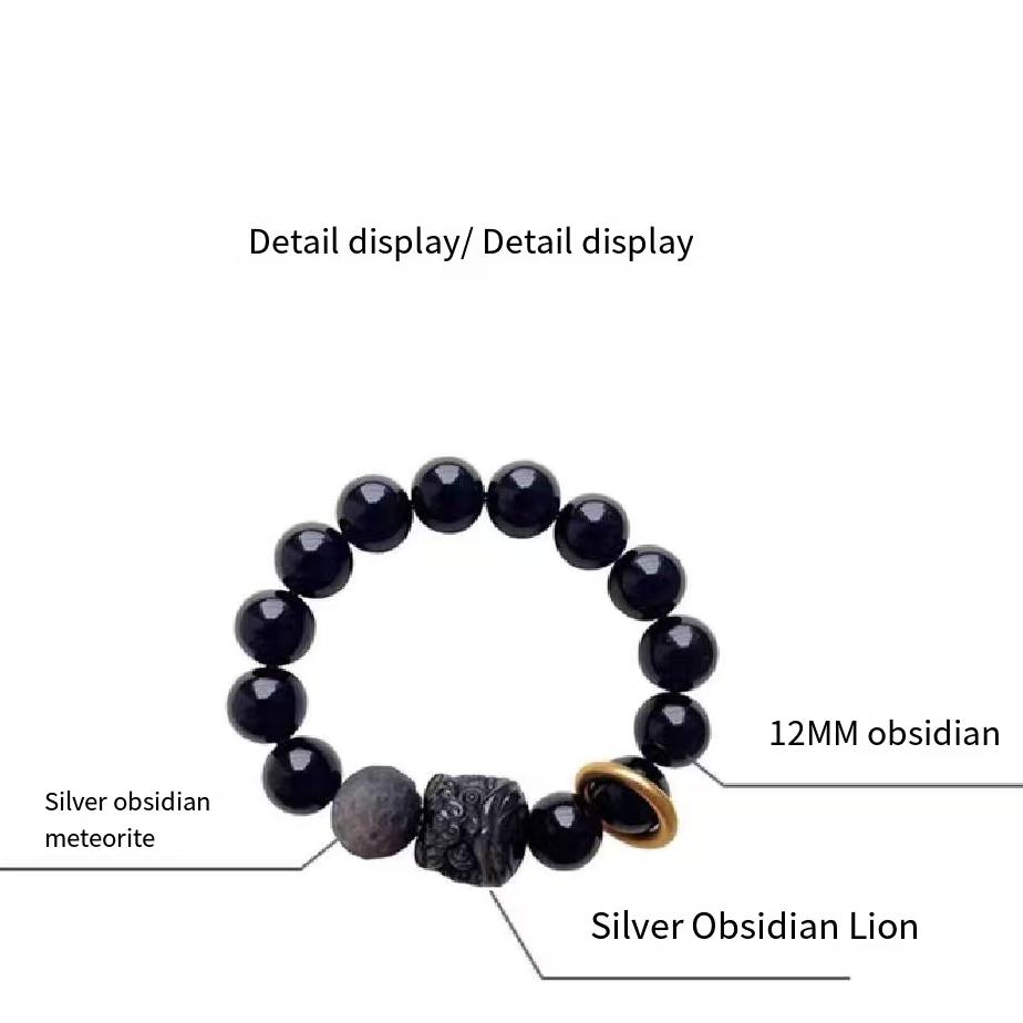 Браслет из обсидиана, серебряный браслет из обсидиана для пары, бусины на удачу в виде льва, приносящие богатство и мир парню в подарок. Для окружности запястья 16-18 см.