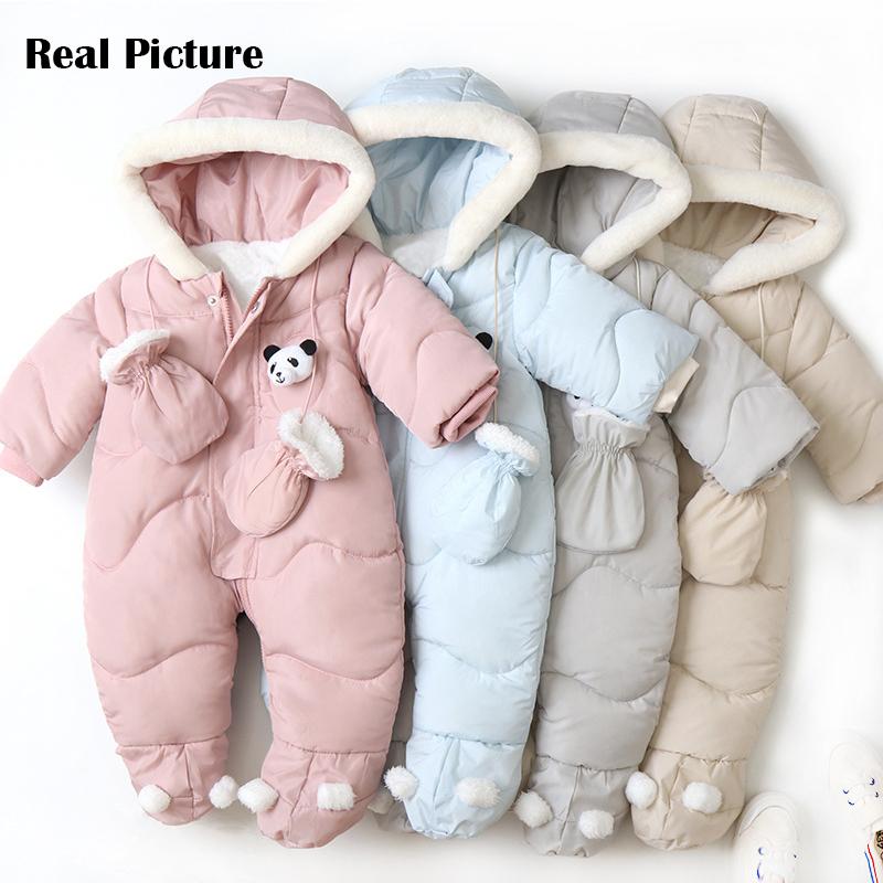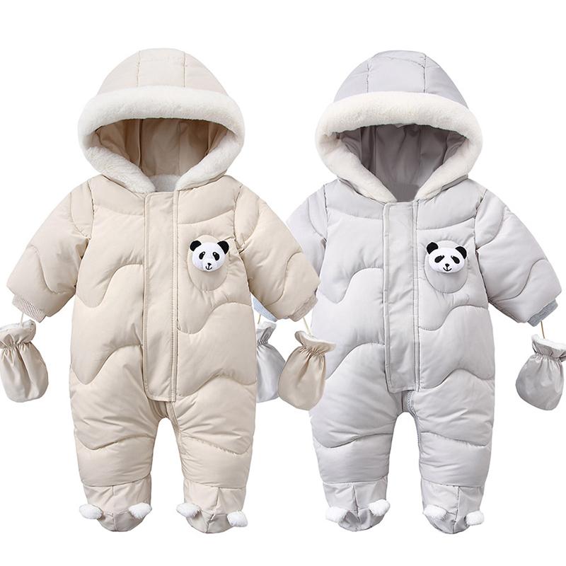 Зимний комбинезон для новорожденных, теплый комбинезон для мальчиков с пандой и перчатками, одежда для младенцев из хлопка и бархата, одежда с капюшоном для девочек 0-18 месяцев