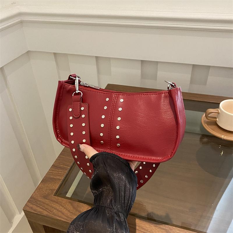 Повседневная женская простая сумка 2024 года, новая осенняя ретро-мода, заклепки, простая широкополосная сумка на одно плечо с косым ремешком, маленькая квадратная сумка
