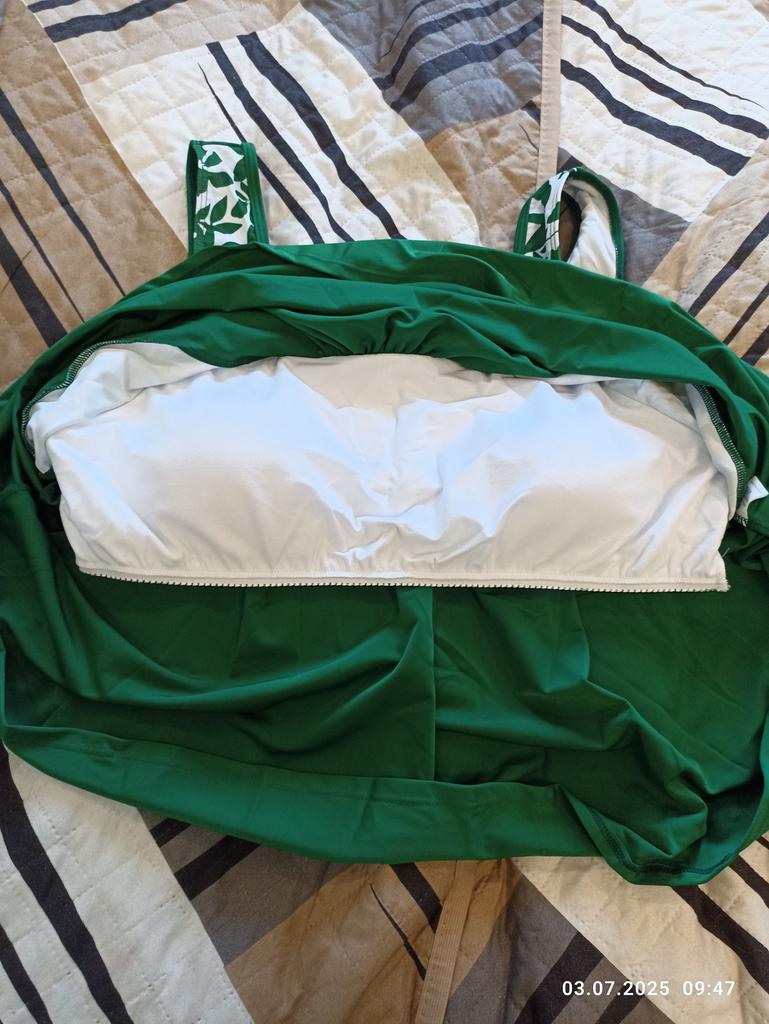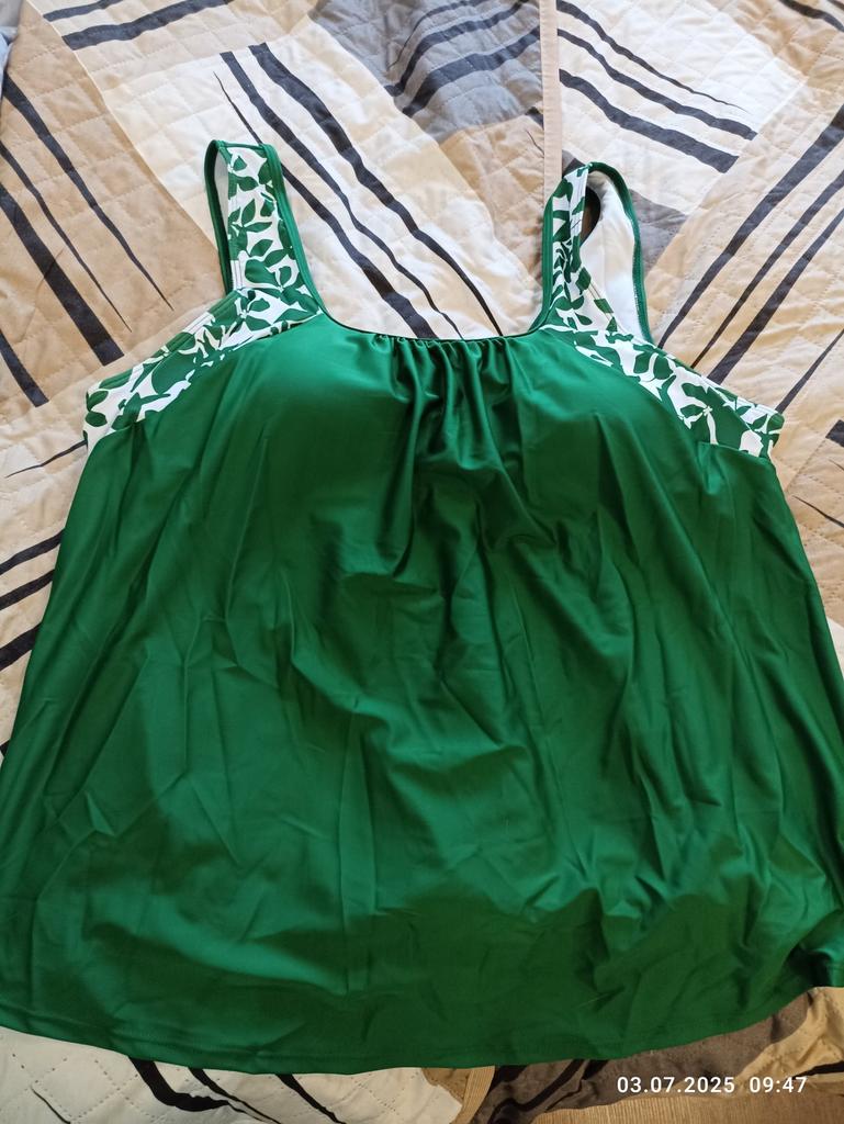 Брала на 56 размер, сел отлично, удобный комплект. Шорты рассчитаны на широкие бёдра. Из верхней части купальника удалила чашечки, без них стало лучше, но тут надо смотреть каждому индивидуально. У верхней части купальника есть сетчатая подкладка с резинкой по краю под грудью, она тянет верхнюю ткань в районе проймы спереди и получаются некрасивые складки. Цвет реально, как на фото, ткань плотная, эластичная.