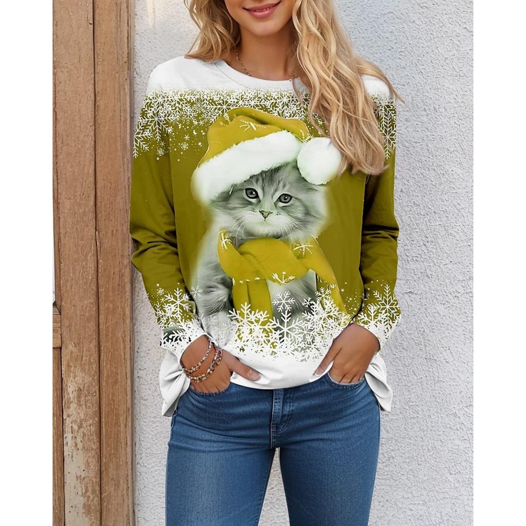 Женские рождественские футболки с забавным рисунком кота, с длинным рукавом, с рождественскими снежинками, 3D-принтом, уличные женские повседневные топы 8XL размера плюс