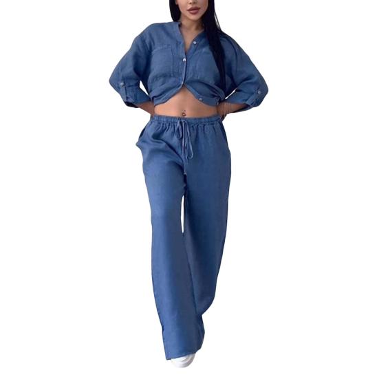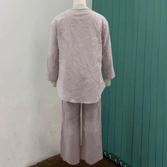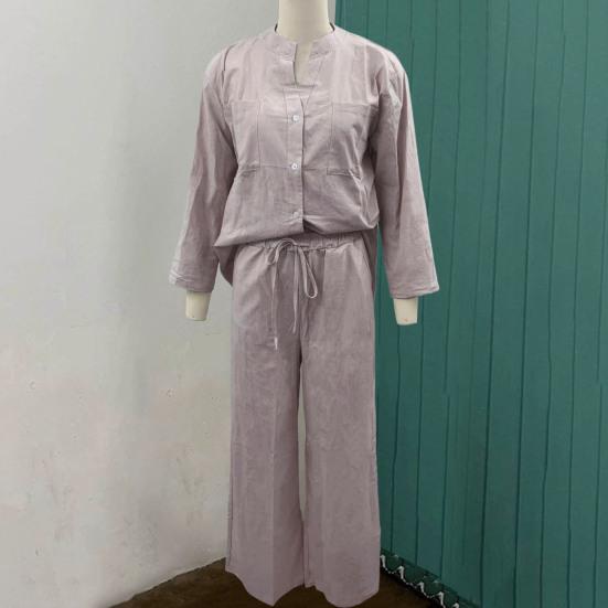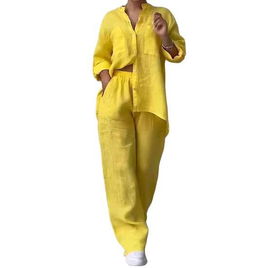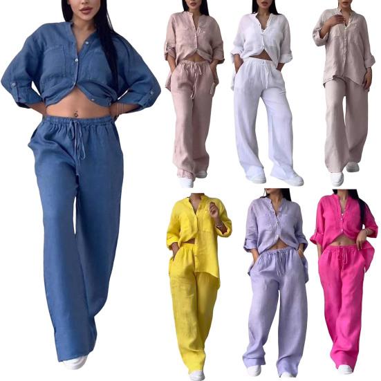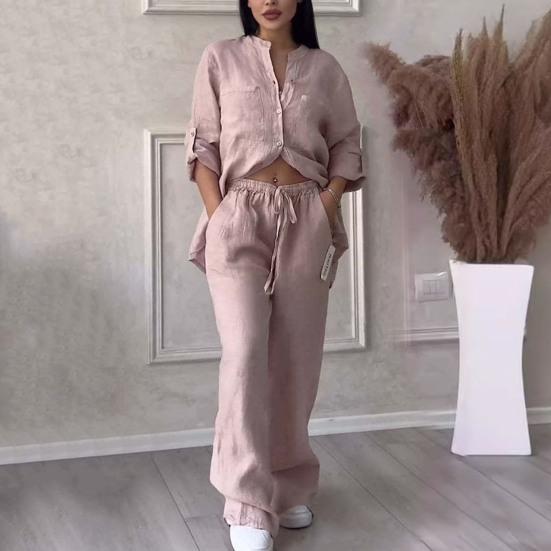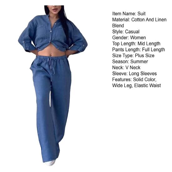Этот универсальный женский костюм-двойка идеально подходит для всех сезонов, обеспечивая воздухопроницаемость и комфорт весной, летом и осенью.. В комплект входят стильная рубашка и брюки свободного кроя, однотонные, с длинными рукавами, однобортного кроя и удобными карманами.. Широкие брюки с двойными боковыми карманами придают нотку моды повседневному повседневному стилю OL.