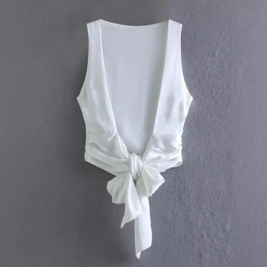 Поднимите свой стиль с помощью этого модного женского жилета в пригородном стиле.. Этот топ с солидным дизайном, силуэтом без спинки и без рукавов излучает элегантность.. Застежка-бабочка сзади придает очаровательный вид..