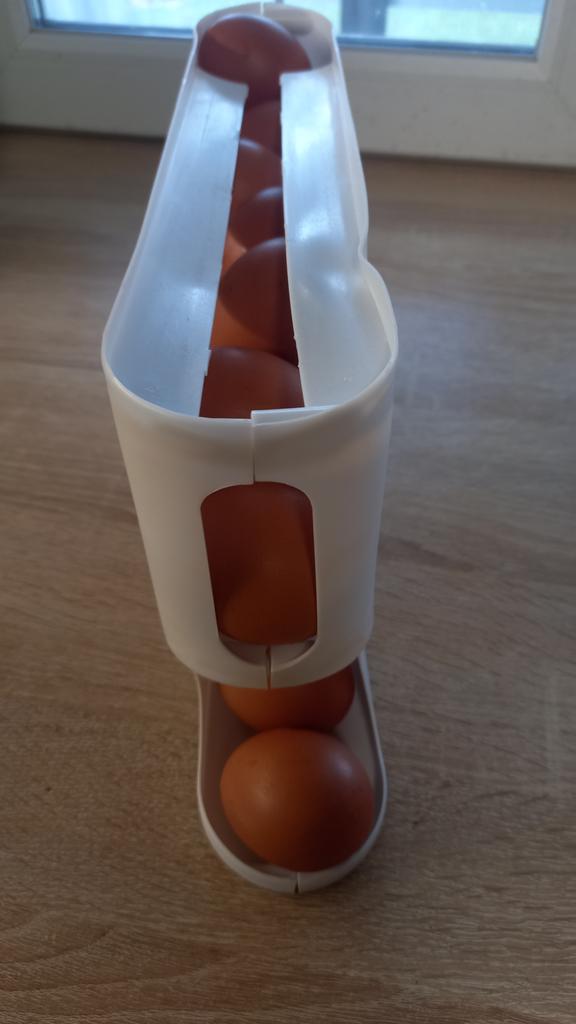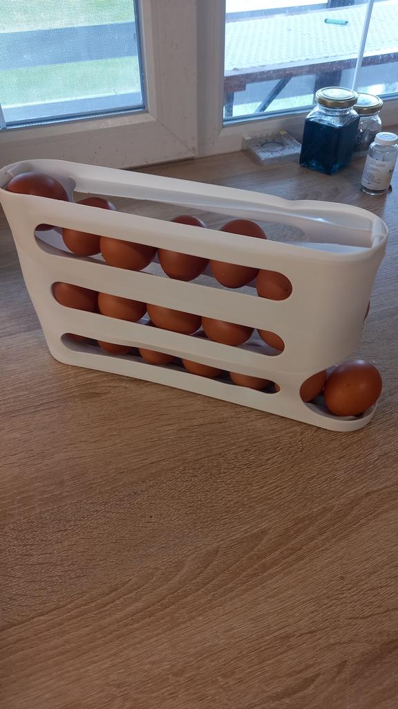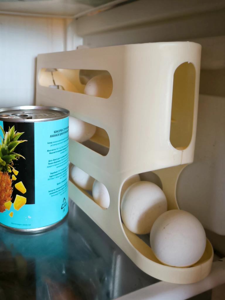 Органайзер для хранения яиц 🥚 🥚 Занимает в холодильнике совсем немного места Яйца кладутся на бочок и благодаря специальной наклонной конструкции, скатываются сами вниз, когда берёшь яйцо. Органайзер пластиковый, крепкий Товар пришёл надежно упакованный в коробку. На яйцах тоже проверили) все работает, ни одно яйцо не пострадало. В процессе яйца иногда застревают и создают пробку.