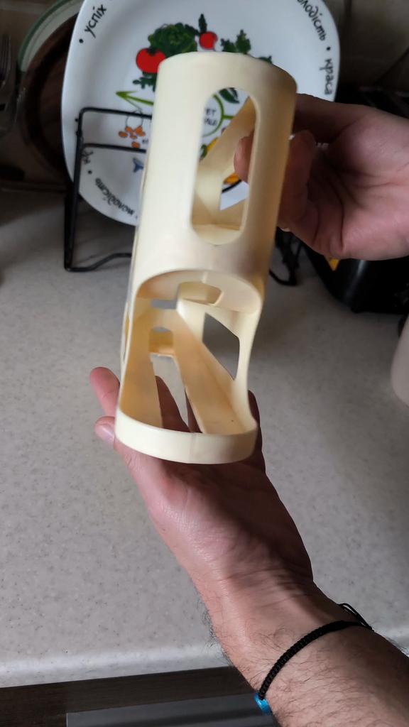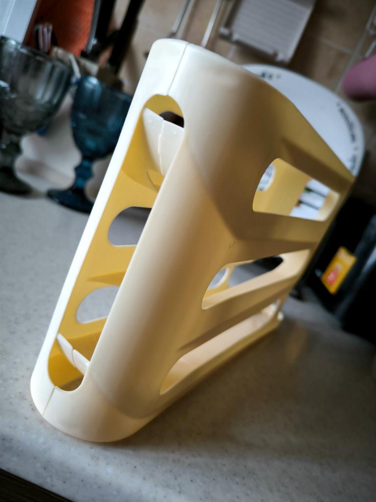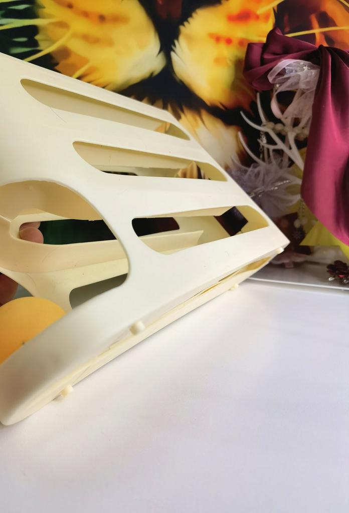Пластик с необработанными краями, разваливается на 2 части. Для маленьких яиц, чуть яйцо побольше в канавку не пролазит. Все кривое, не верте картинке. Ощущение, что вылили из пластмассы в подворотне.
