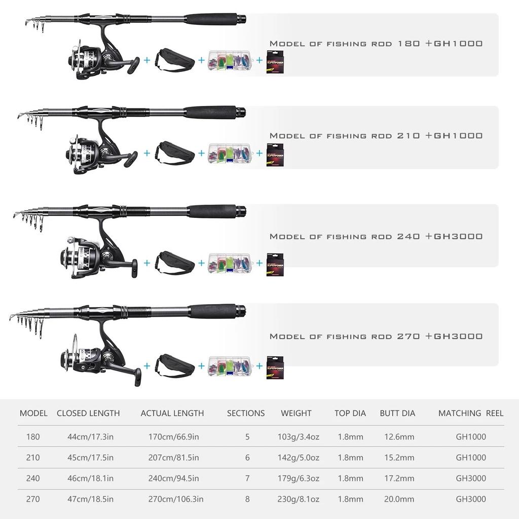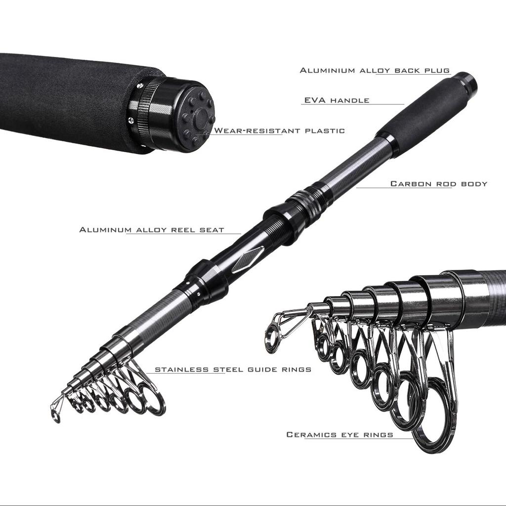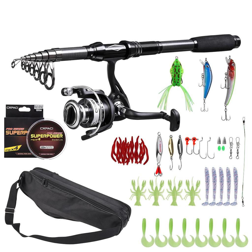 В комплект входят катушки для удочек и необходимые аксессуары для рыбалки: ОДНА телескопическая удочка из углеродного волокна + ОДНА спиннинговая катушка + плетеная леска + аксессуары для приманок