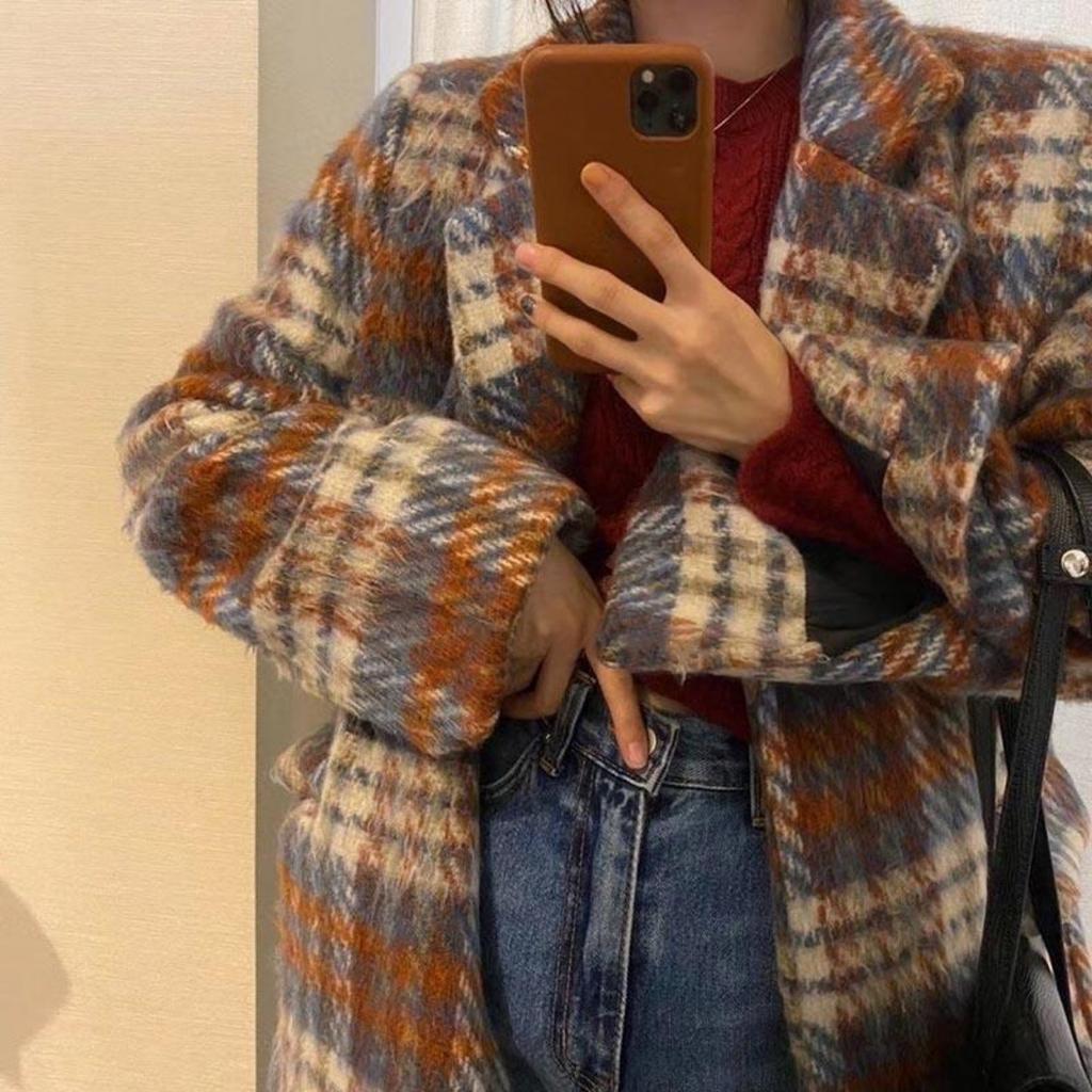 Шерстяное пальто для женщин, осеннее и зимнее теплое уютное пальто, утолщенный свободный костюм, повседневное твидовое пальто в клетку