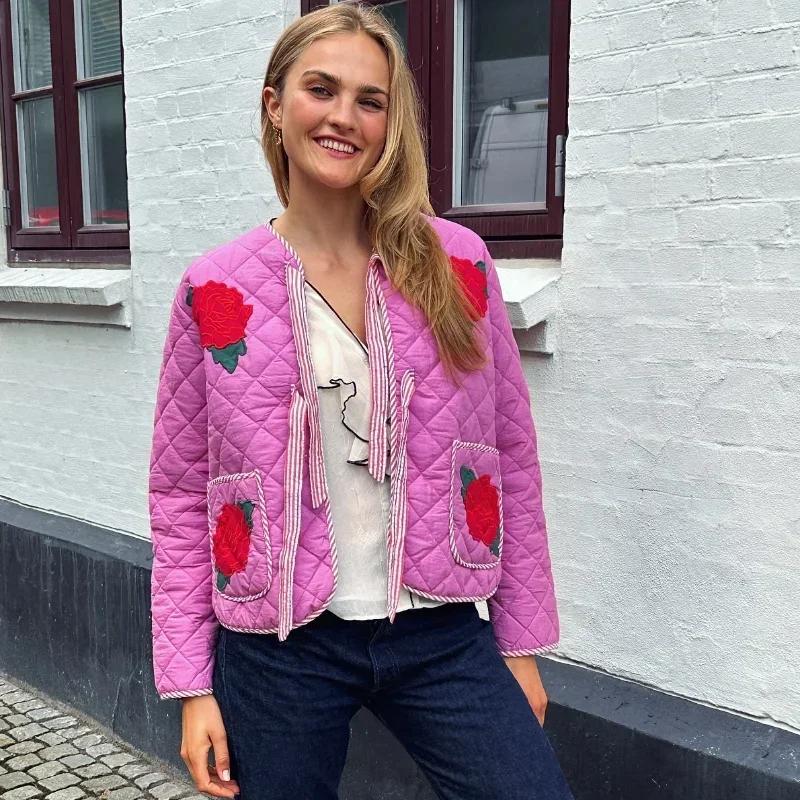 Женская хлопковая куртка с цветочным принтом на шнуровке, шикарный О-образный вырез, карман, длинное рукавное пальто, осень 2024 г., женская стеганая теплая верхняя одежда с подкладкой