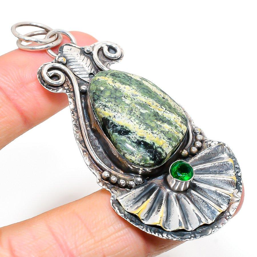 Подвеска из натурального полосатого зеленого опала и диопсида из стерлингового серебра 925 пробы 2,84 дюйма