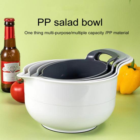 Представляем универсальный набор салатников, который необходим на каждой кухне! Этот набор мисок для смешивания создан для удобства и функциональности.. Миски можно сложить вместе для компактного хранения, что экономит ценное пространство на кухне.. Эти миски изготовлены из материалов, не содержащих бисфенол А, и безопасны для приготовления и хранения пищи.. Нескользящая конструкция оснащена носиком и ручкой для удобства использования..