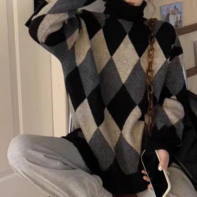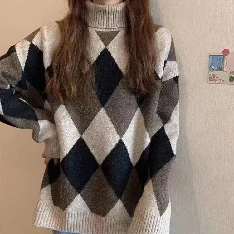 Корейская версия свитера с воротником-стойкой, женский, с длинными рукавами, контрастная ромбовидная сетка, повседневный вязаный свитер для женщин, внутренний слой, основа