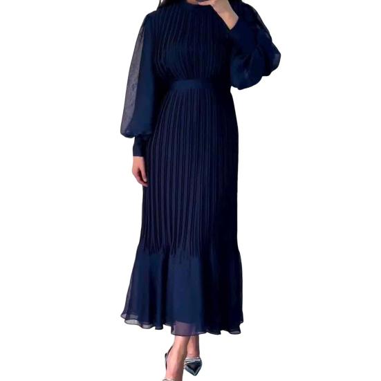Дизайн плиссированной юбки: Ощутите непреходящее очарование этого длинного платья с плиссированной юбкой, создающей изящный и подчеркивающий достоинства фигуры силуэт.. Складки придают вашему наряду глубину и динамичность, делая его универсальным предметом одежды для разных ситуаций.