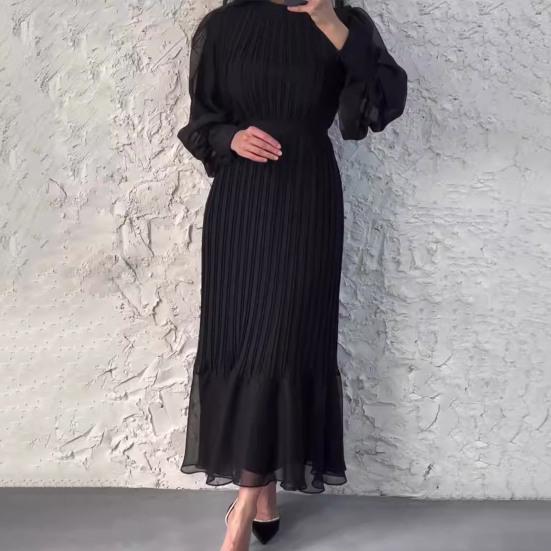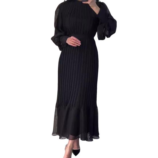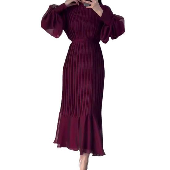 Это элегантное женское платье изготовлено из высококачественного полиэфирного волокна, обеспечивающего эластичность и комфорт.. Модель имеет воротник-стойку, длинные рукава, плиссированную юбку и пояс на талии, что создает привлекательный силуэт.. Однотонный цвет и простой, но стильный вид излучают элегантность и изысканность, что делает его подходящим для различных случаев, таких как повседневная одежда, свидания, работа или вечеринки..