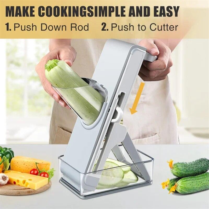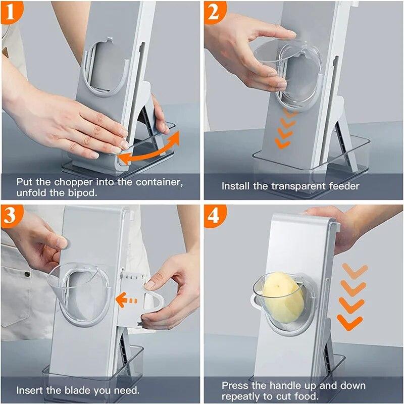 УДОБНЫЙ ДИЗАЙН: Этот ручной измельчитель для пищевых продуктов защищает пальцы и никогда не касается лезвия, легко разрезая, нарезая кубиками, нарезая кубиками и нарезая овощи и фрукты на формы и размеры с минимальной экономией времени. Слайсер станет хорошим помощником на вашей кухне.
