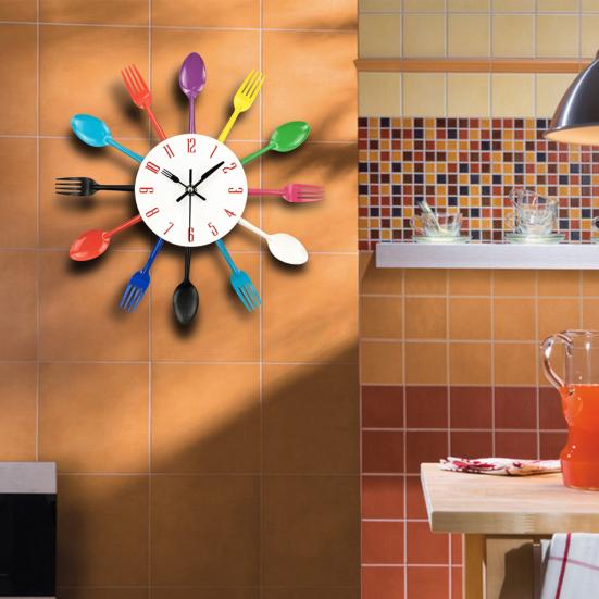 Современные столовые приборы, нож, вилка, ложка, кварцевые настенные часы, аналоговое украшение для домашнего офиса