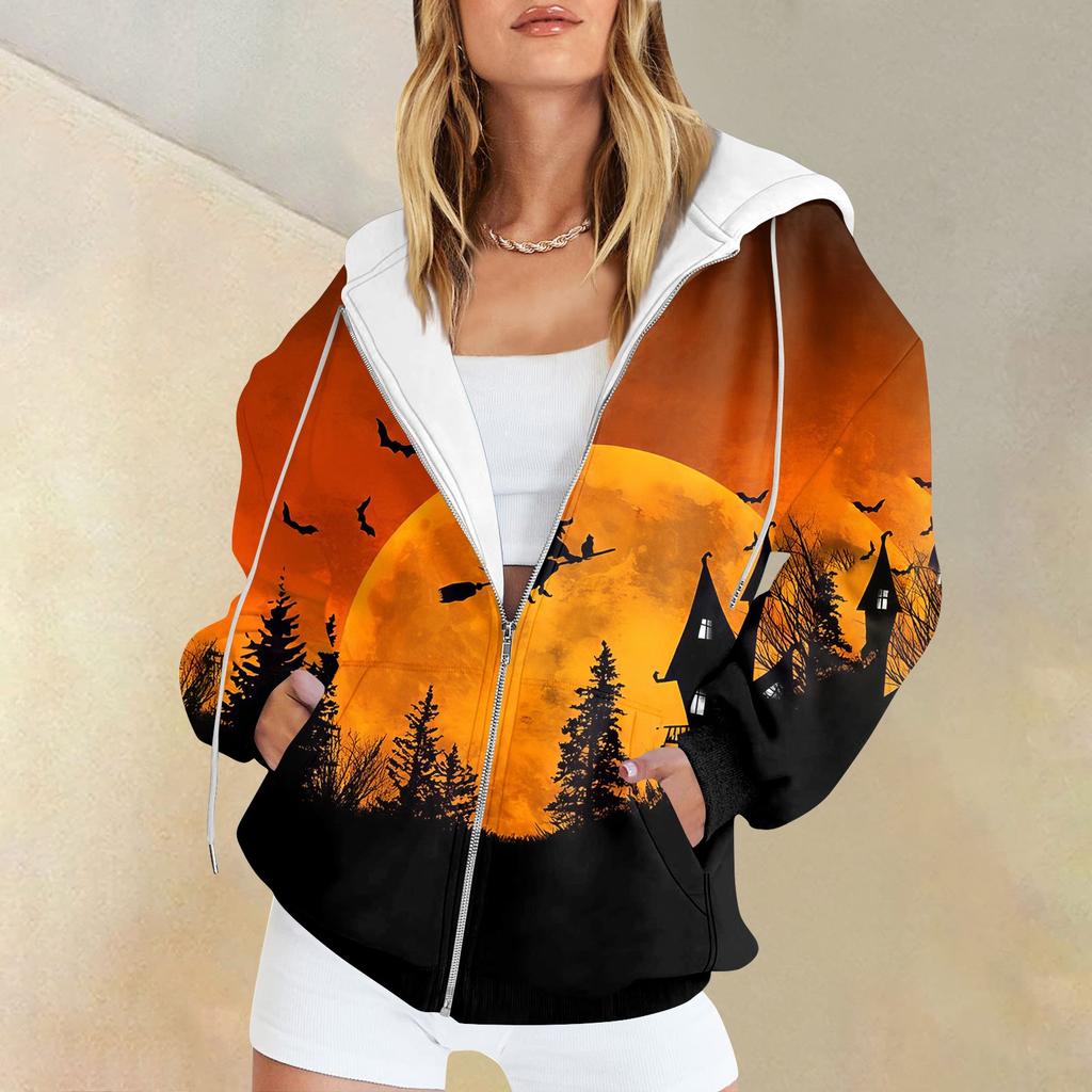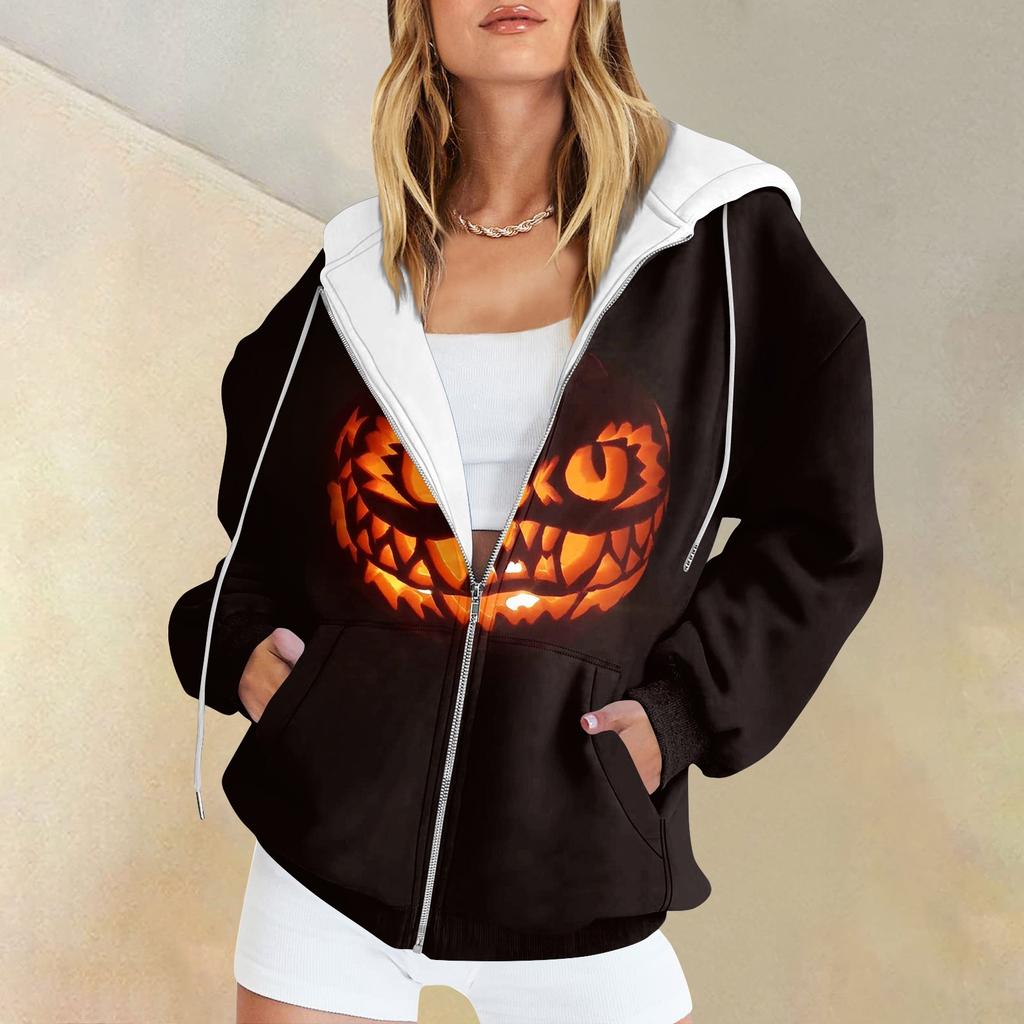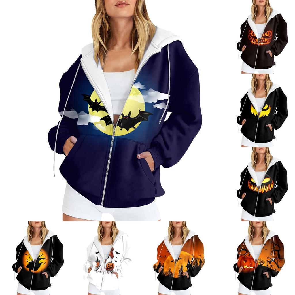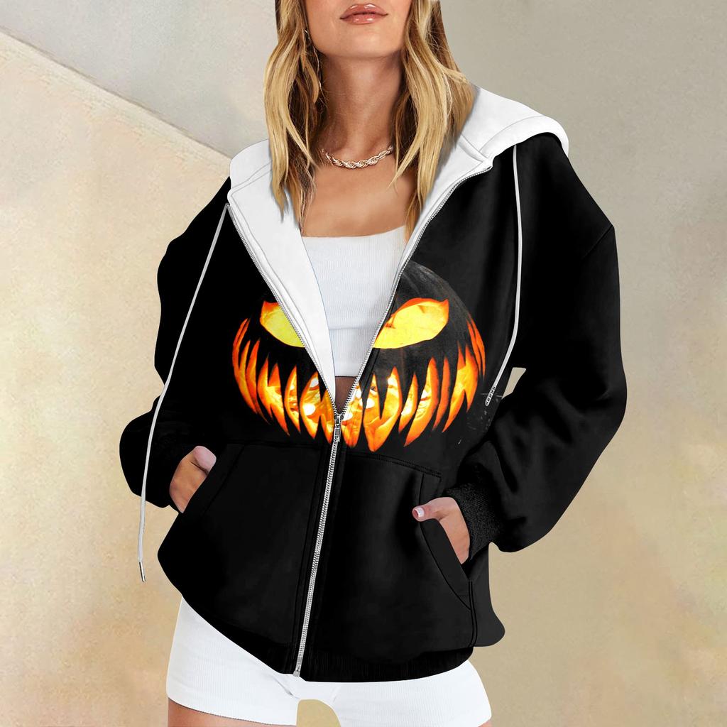 Женская мода повседневная толстовка с принтом на Хэллоуин осень-зима с длинным рукавом кардиган с карманами на молнии куртка с капюшоном