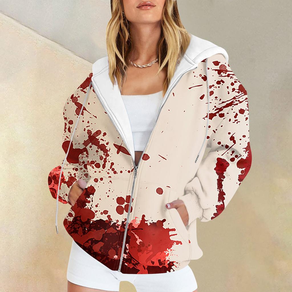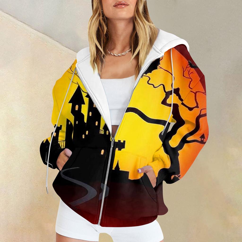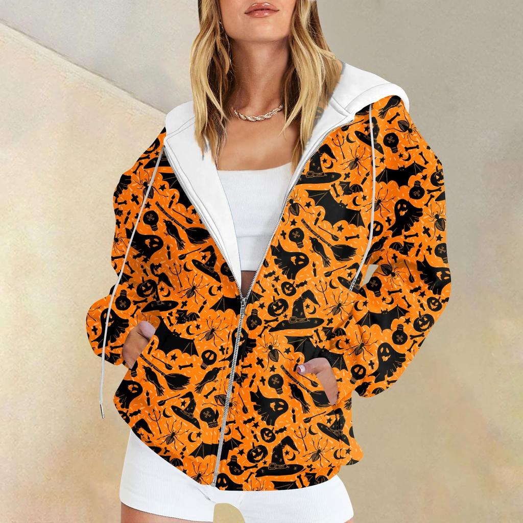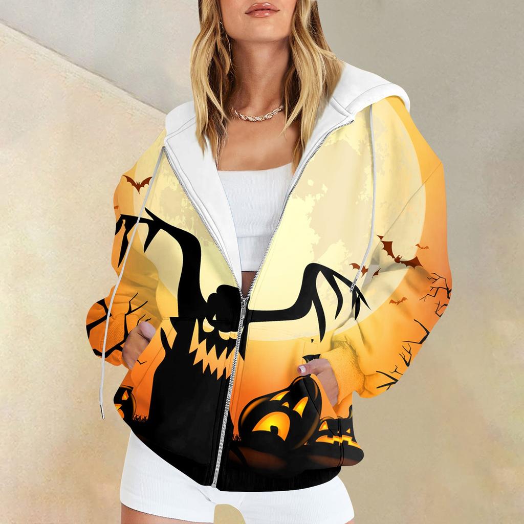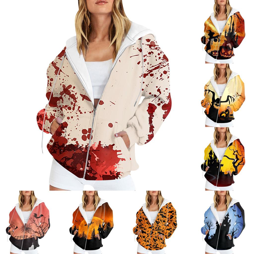 Женская мода повседневная толстовка с принтом на Хэллоуин осень-зима с длинным рукавом кардиган с карманами на молнии куртка с капюшоном