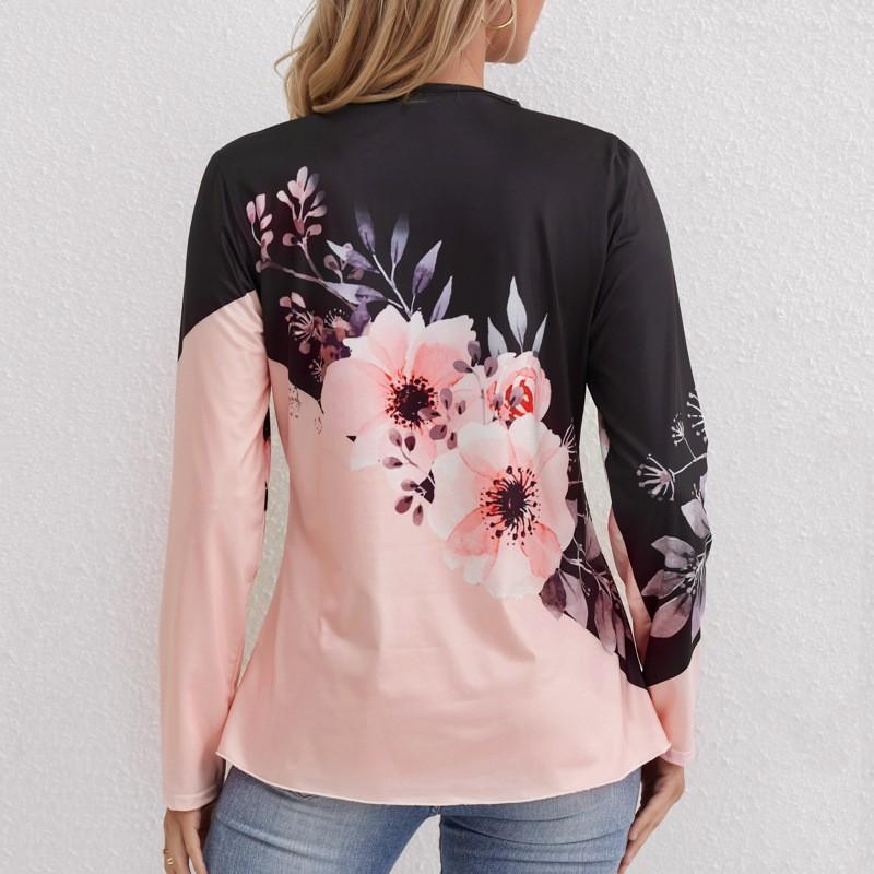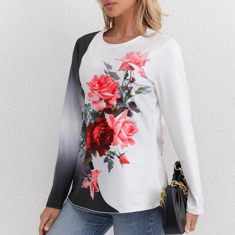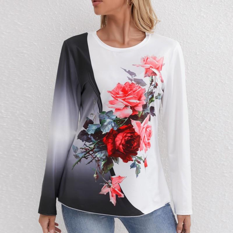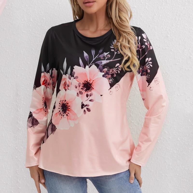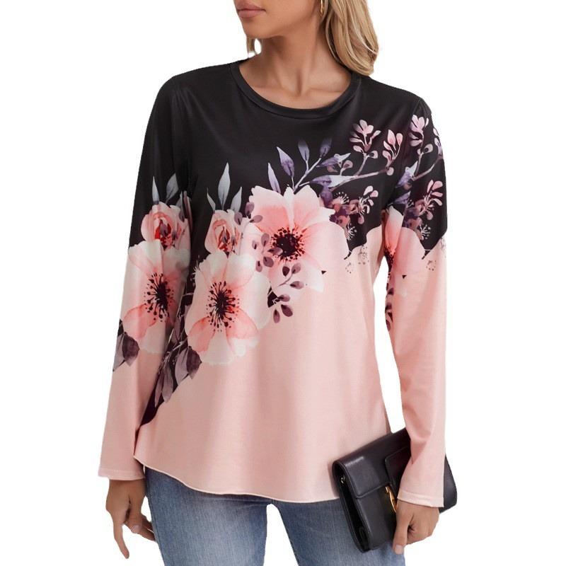 Женская повседневная футболка с длинным рукавом и круглым вырезом с цветочным принтом весна-осень