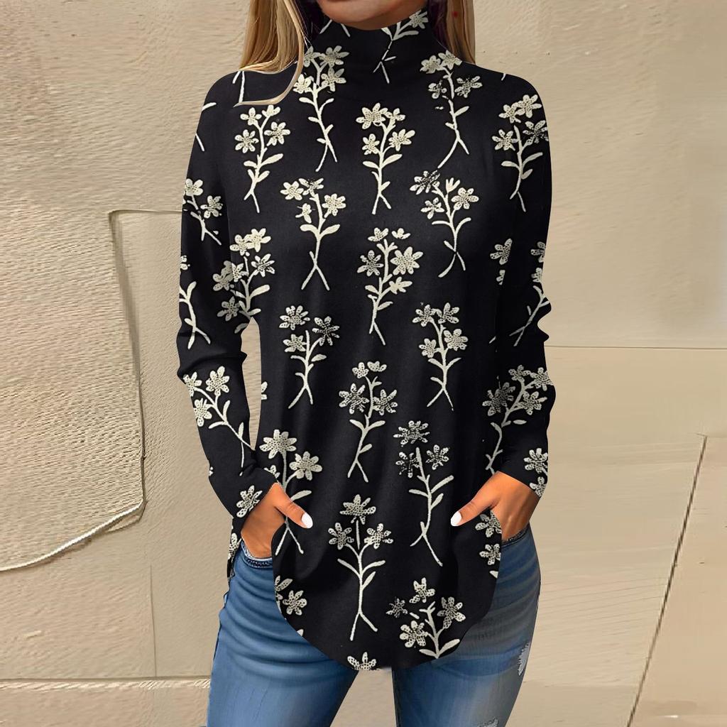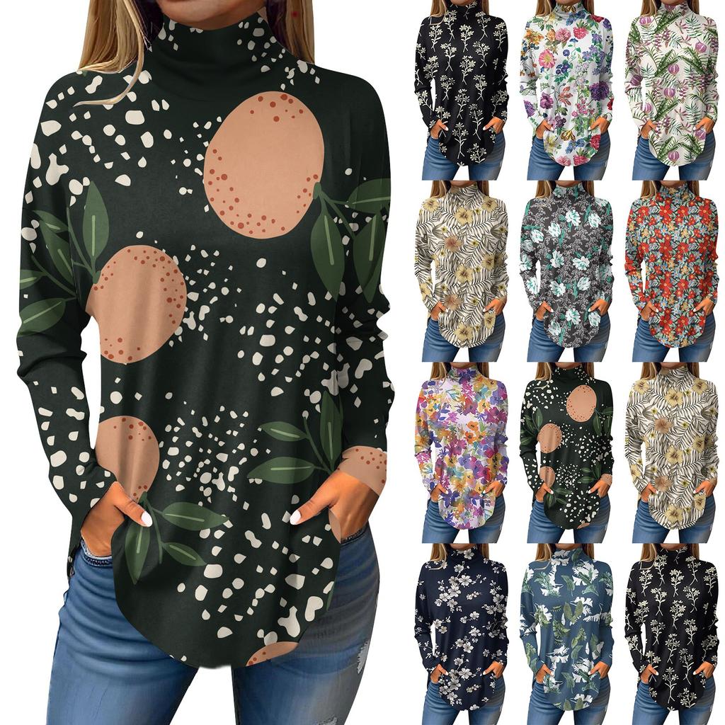 Женская свободная футболка с высоким воротом и длинными рукавами с цветочным принтом в стиле ретро, топ-пуловер