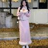 Зимние розовые теплые куртки, костюмы, корейская мода, искусственный мех, комплект из 2 предметов, юбка, женские повседневные пиджаки Y2k, пальто + мини-юбки, шикарные