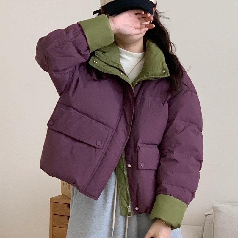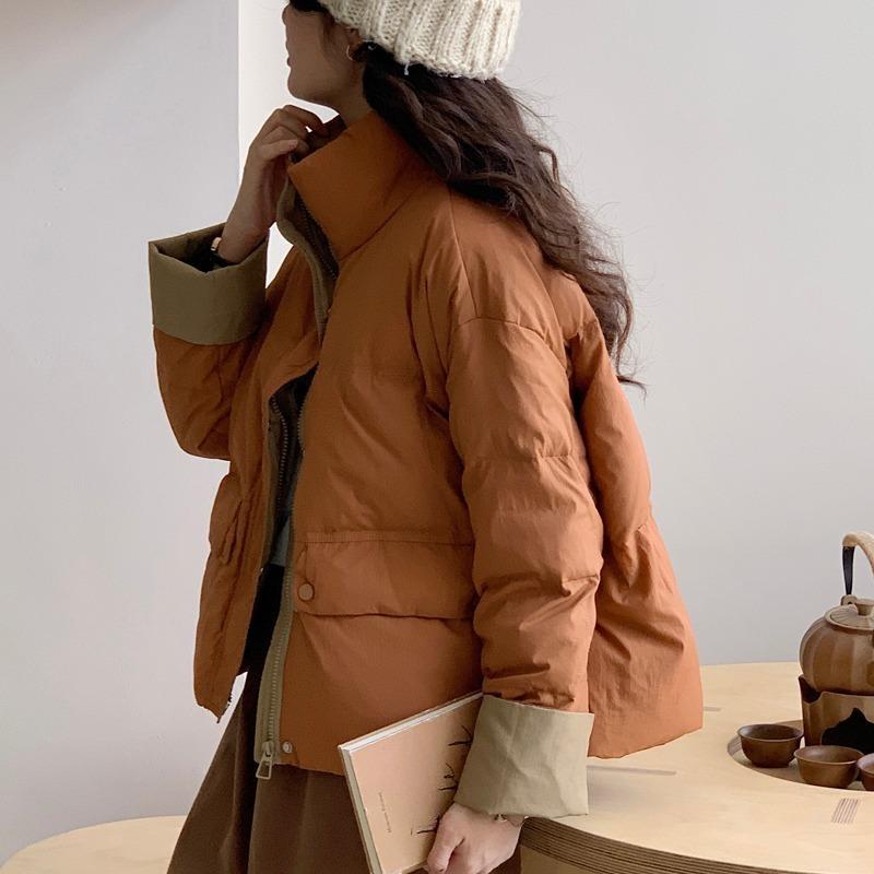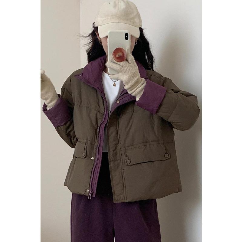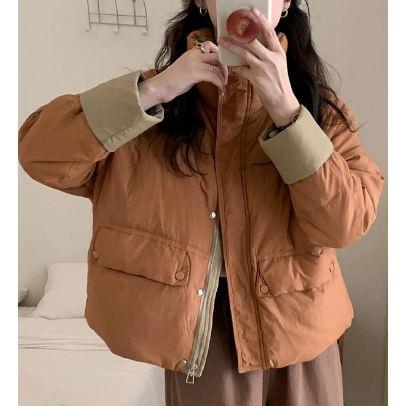 Реальный снимок корейской версии, новый цветной пуховый хлопковый костюм для женщин, короткий модный свободный костюм с воротником-стойкой и толстым пальто