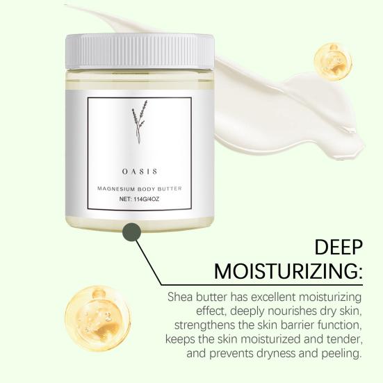 Гидратация, богатая магнием: Обогащенный магнием, этот увлажняющий крем для тела обеспечивает глубокое увлажнение, которое глубоко восстанавливает и устраняет сухость и дискомфорт, способствуя спокойному и гладкому виду кожи.