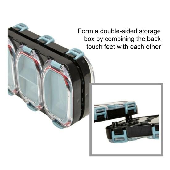 Эффективное решение для хранения данных: Двусторонний ящик для хранения с верхней и нижней комбинацией для универсальной организации рыболовных принадлежностей.. Задние контактные ножки обеспечивают надежное соединение, оптимизируя использование пространства и повышая удобство.