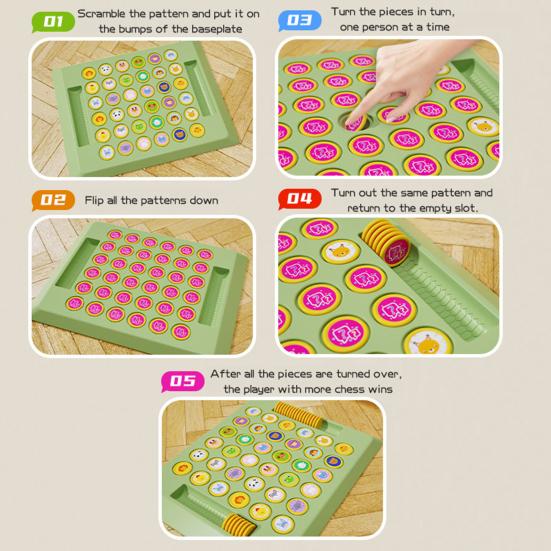Увлекательный игровой процесс для двух человек: Испытайте интерактивное развлечение с обучающими шахматами с изображением животных, в которых игроки стратегически переворачивают фигуры, чтобы сопоставить узоры, развивая когнитивные навыки и укрепляя семейные связи.