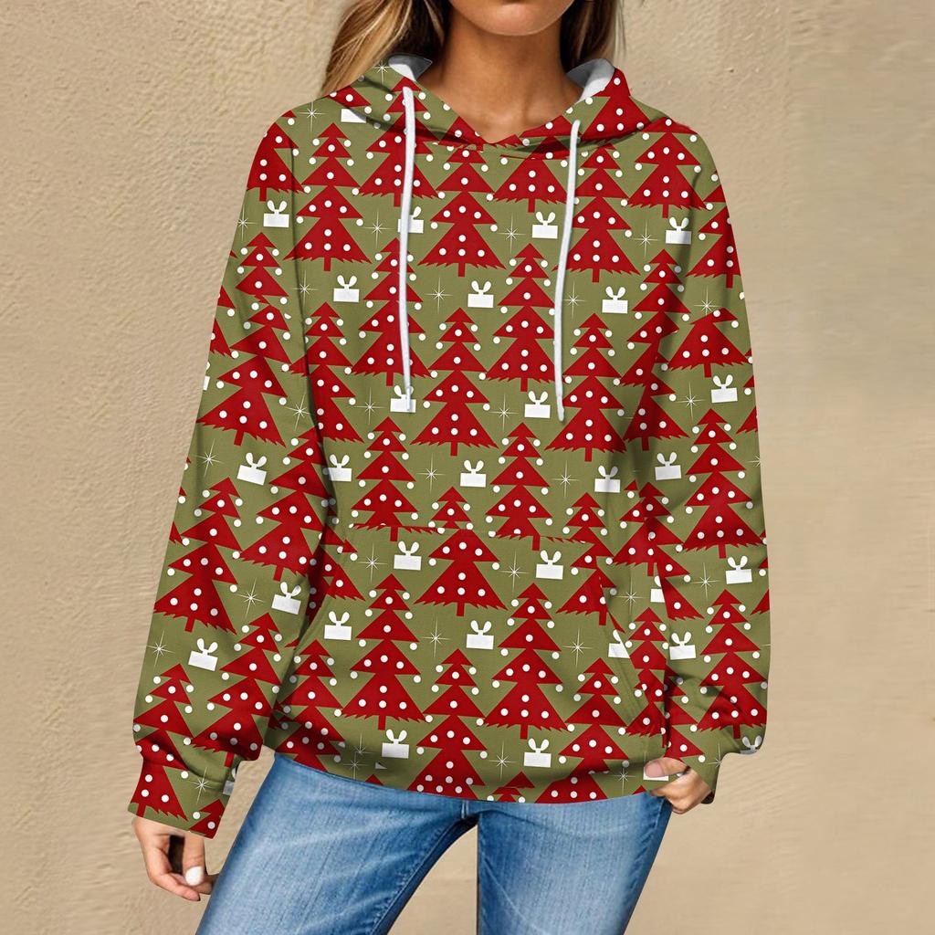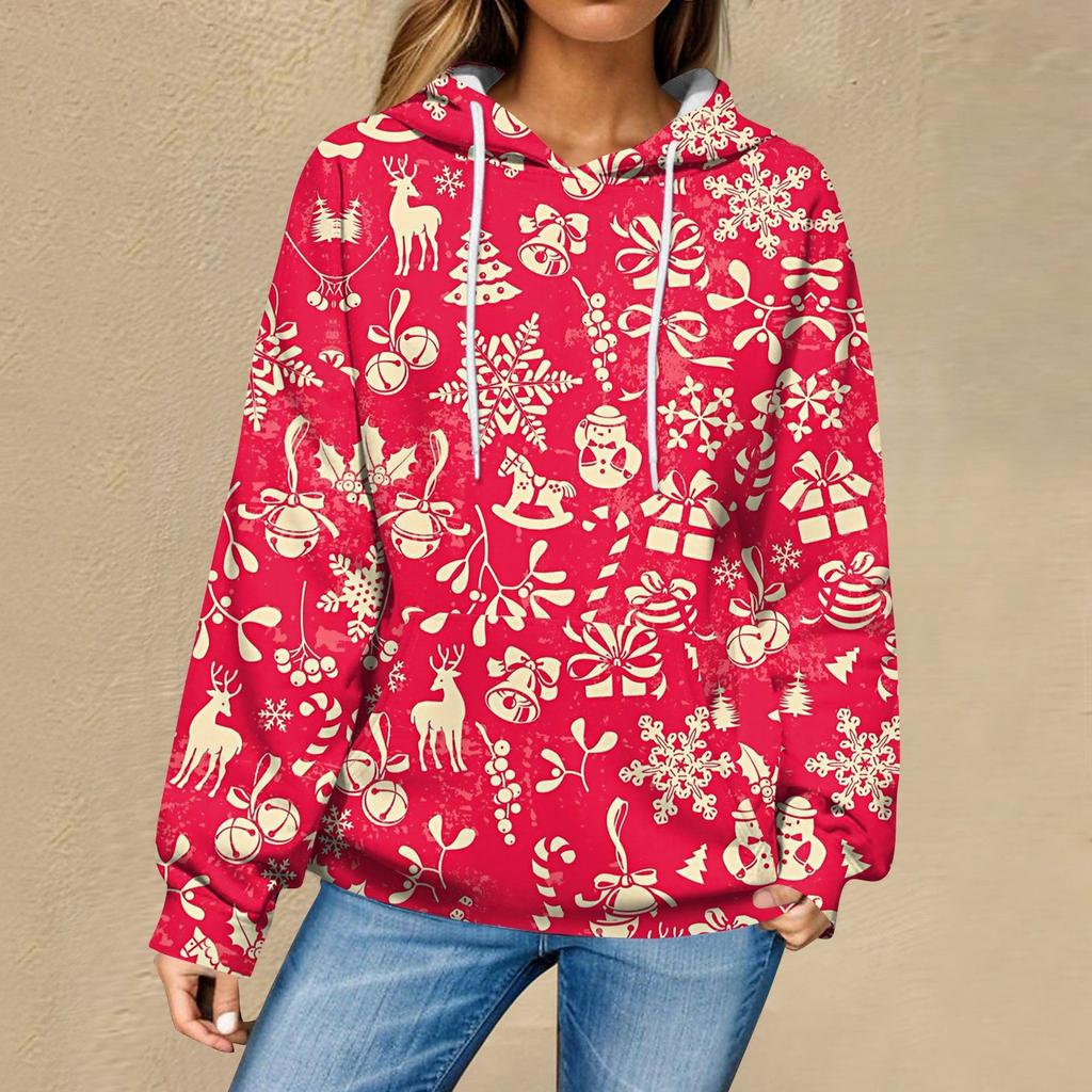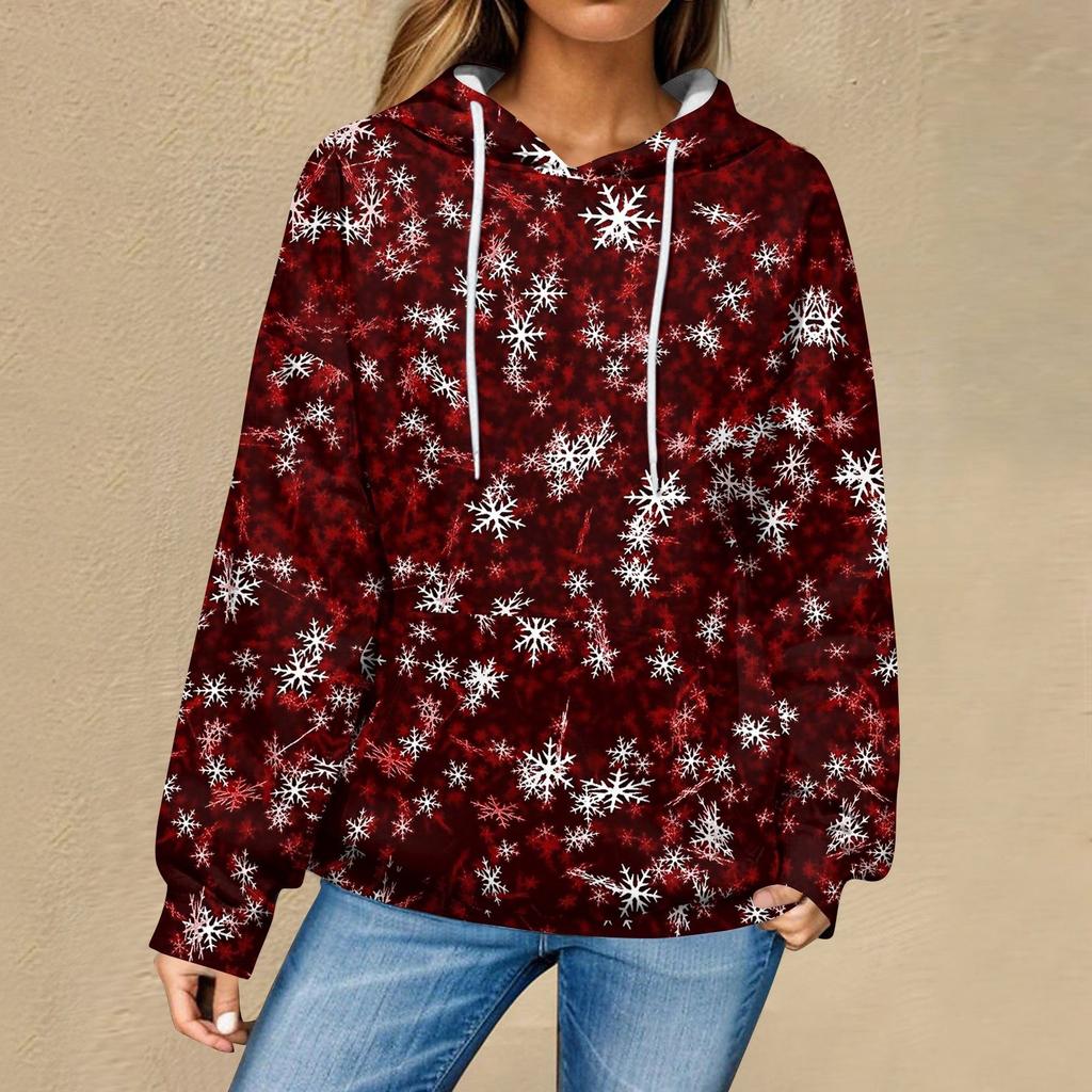 Женская повседневная мода рождественский принт длинный рукав пуловер толстовки с капюшоном свитшоты