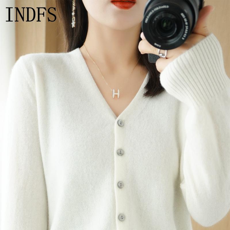 INDFS Женская мода Повседневный Осень Зима Однотонный Принт Длинный Рукав V-образный Вырез Свитера