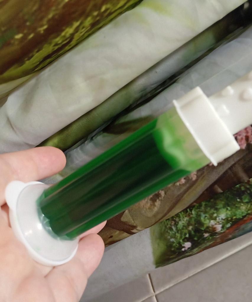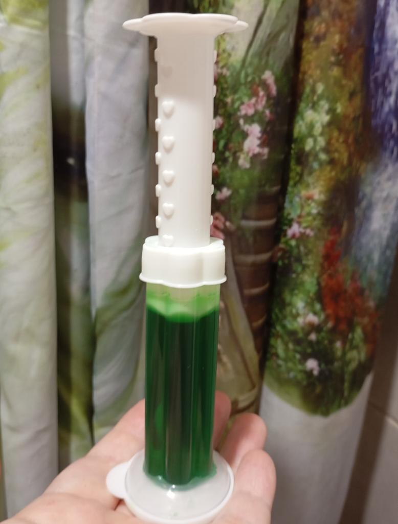 Гель-ароматизатор для ванной и туалета💦💚 Повторная покупка: жёлтый понравился, заказала следом зелёный. 🍋На выбор несколько ароматов, на этот раз выбрала зеленый 💦В применении не сложен: снимаешь защитную пробку шприца, а с другой стороны вставляешь поршень и потихоньку крутишь 🌸Выдавливаются симпатичные цветочки, главное, не переборщить, тогда хватит примерно на 18 цветков ✨Аромат приятный 💦Что хорошо - гель не смывается сразу, держится и ароматизирует ванную (у нас смежный санузел). Со вторым флаконом я более осторожна, а то с первым вначале не рассчитала. На фото флакон уже несколько раз использованный. И опять не удержалась, купила ещё три, разных цветов - жду. Удобно! Могу рекомендовать, отличная идея. Удачных покупок💋