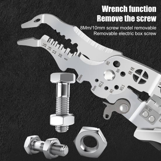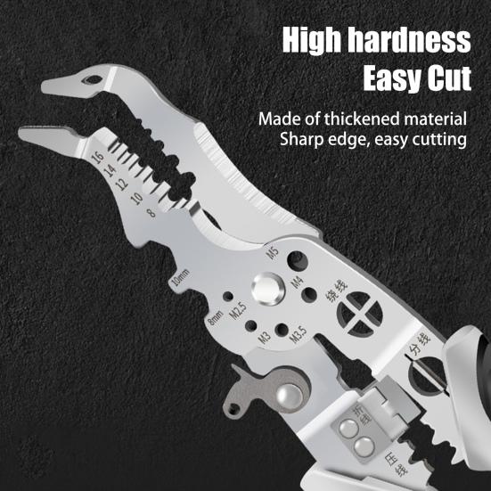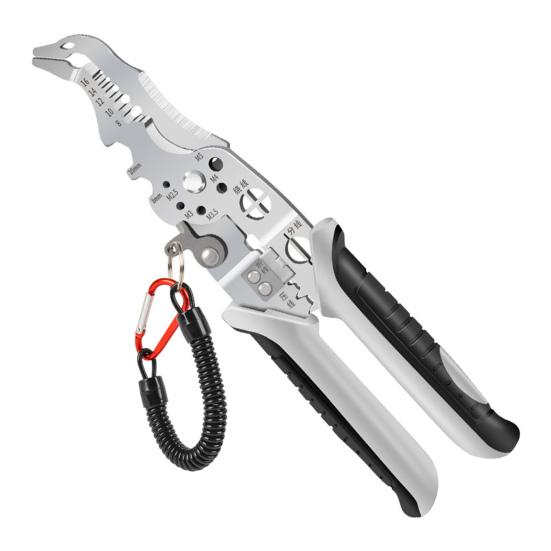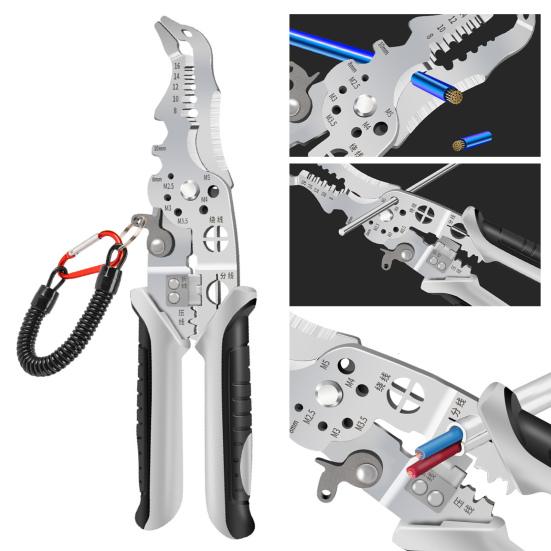 Этот многофункциональный инструмент сочетает в себе возможности зачистки, обжима и резки кабеля, удовлетворяя различные требования электриков, такие как разрыв провода, зачистка, обжатие, намотка, расщепление, зажим, скручивание и затягивание.
