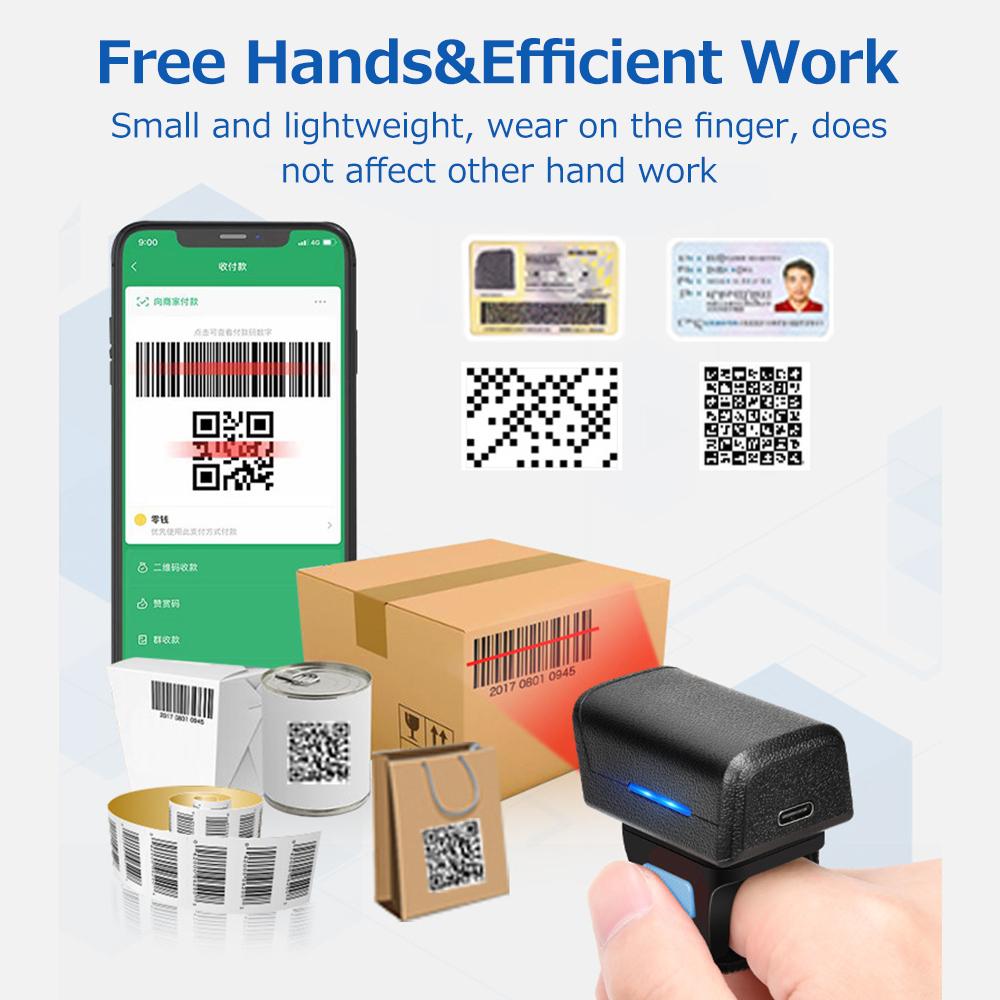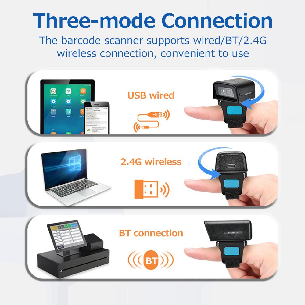 Носимый кольцевой сканер штрих-кода Проводной USB + 2,4G + BT Трехрежимное соединение Поддержка одномерного