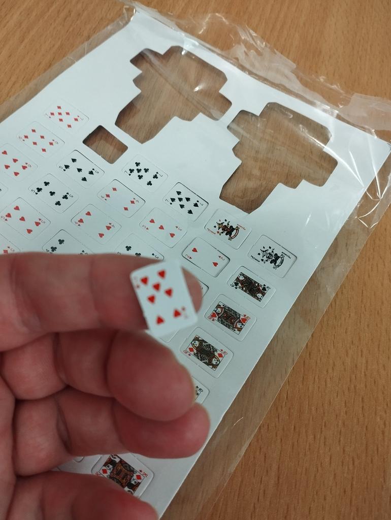 Слишком маленькие 1.5 см x1 см. Крести и буби легко перепутать из - за малого размера. Неудобно брать и складывать. Не оправдали ожиданий.
