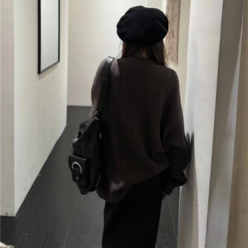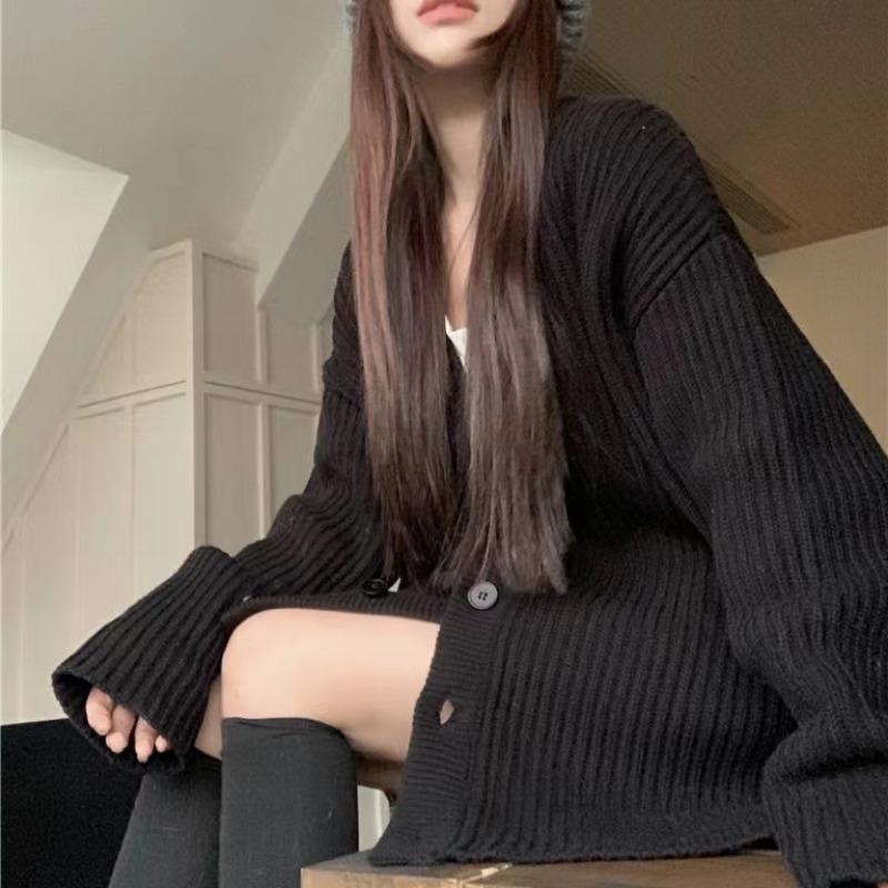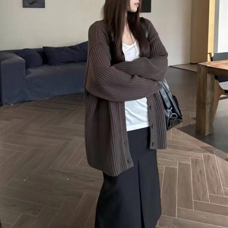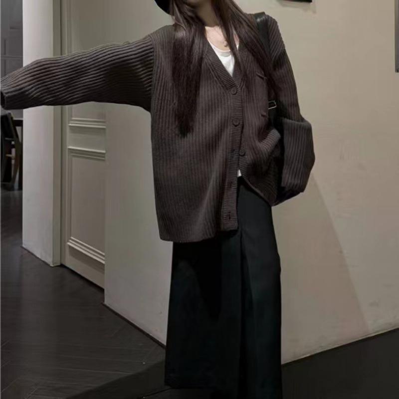 Женские однотонные винтажные модные повседневные вязаные кардиганы Зимние свободные однобортные с карманами и длинными рукавами и V-образным вырезом свитера