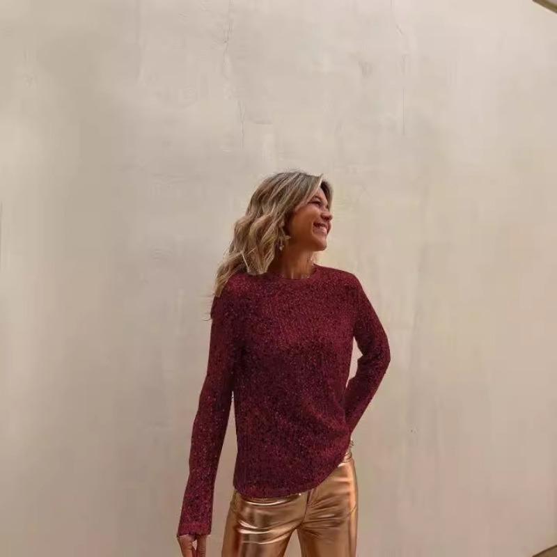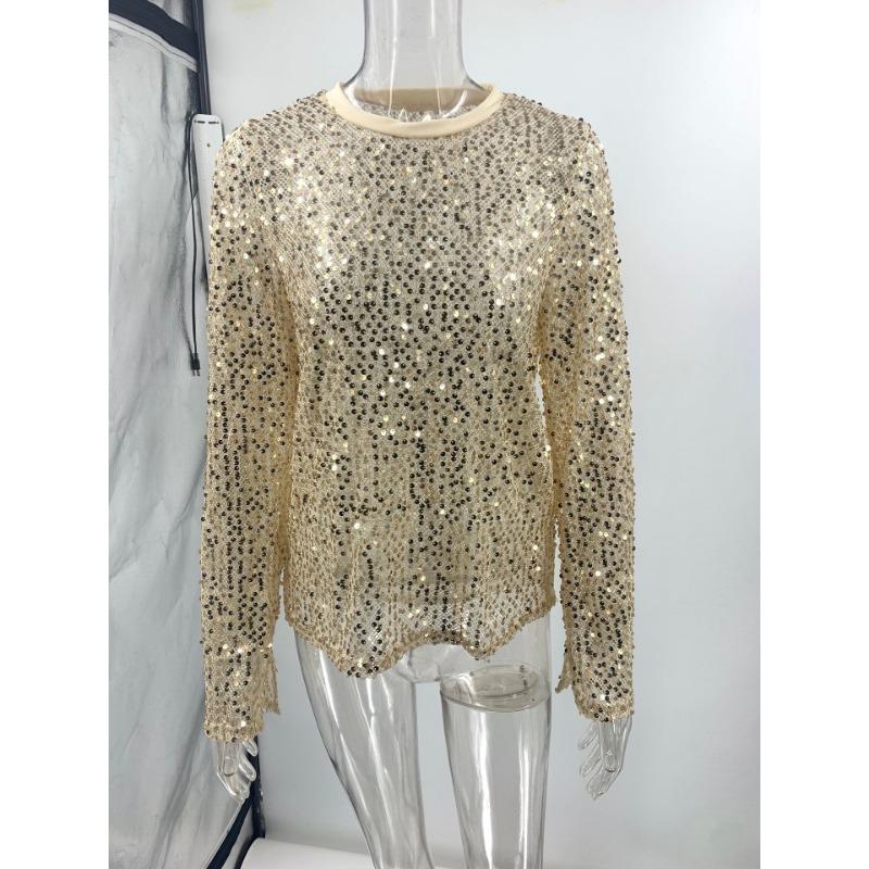 Весна Осень Модный сетчатый топ с пайетками и длинными рукавами, облегающий топ с круглым вырезом, пуловеры и длинные рукава (Женский)