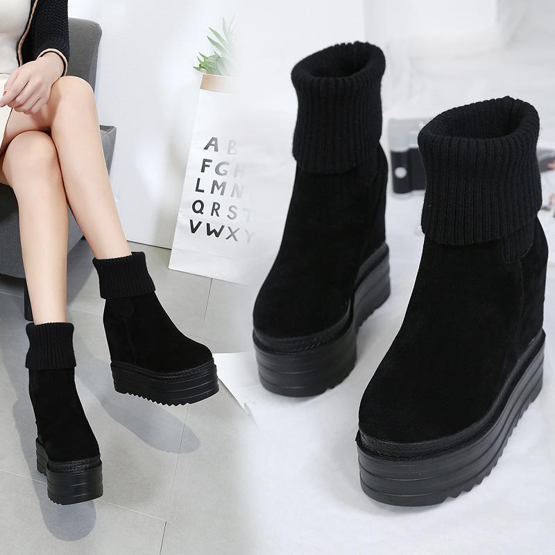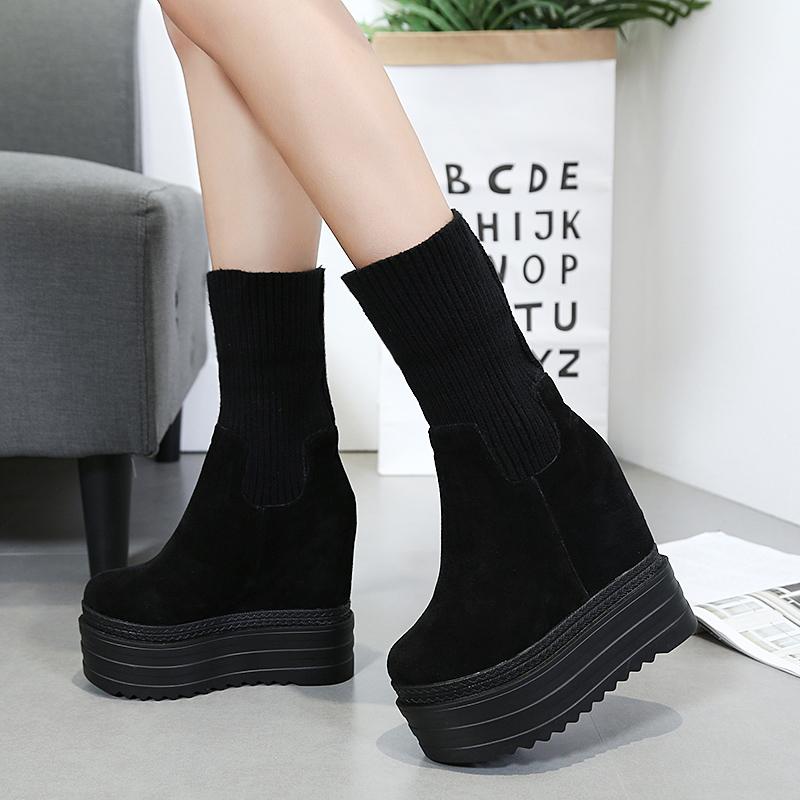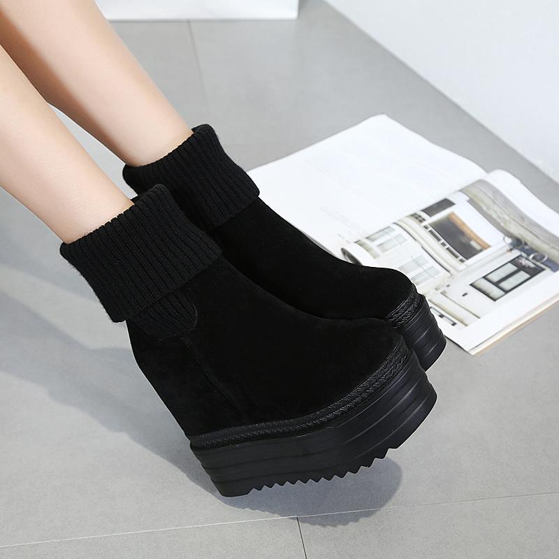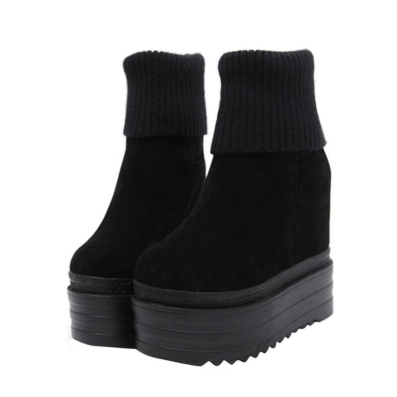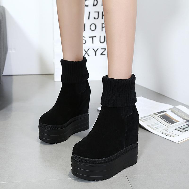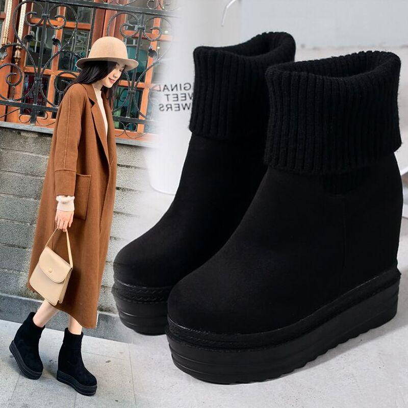 2024 зимние женские ботильоны на танкетке, высокие ботинки на платформе, толстые туфли на высоком каблуке, черные повседневные вязаные ботинки