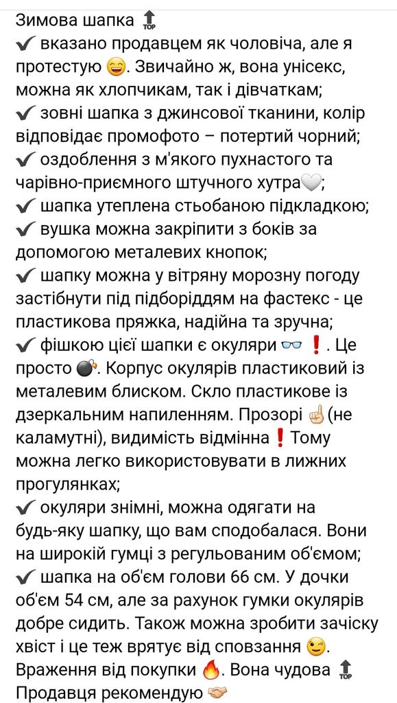 Зимняя шапка 🔝 ✔ указано продавцом как мужская, но я протестую 😄. Конечно же, она унисекс, можно как мальчикам, так и девочкам; ✔ снаружи шапка из джинсовой ткани, цвет 100% соответствует промофото - потёртый чёрный; ✔ отделка из мягкого пушистого и прелестно-приятного искусственного меха🤍; ✔ внутри шапка утеплена стёганной подкладкой; ✔ ушки можно закрепить по бокам с помощью металлических кнопок; ✔ саму шапку можно в ветренную морозную погоду застегнуть под подбородком на фастекс - это пластиковая пряжка, которая очень популярна в сфере производства снаряжения, верхней и спортивной одежды, сумок,рюкзаков, обуви. Фастекс состоит из двух или трех частей, к каждой из которых крепится ремень, стропа. В одной части застежки есть подвижные зубцы, а во второй — отверстия-пазы, в этом случае, происходит качественная фиксация,которая подтверждается характерным звуком щелчка. Надёжная и удобная застёжка; ✔ фишкой этой шапки являются очки 👓 ❗. Это просто 💣. Корпус очков пластиковый с металлическим блеском. Стёкла пластиковые с зеркальным напылением. Прозрачные ☝🏻(не мутные), видимость отличная❗Поэтому можно запросто использовать в лыжных прогулках; ✔ очки съёмные, можно одевать на любую понравившуюся вам шапку. Они на широкой резинке с регулируемым объёмом; ✔ шапка на объём головы см. У дочери объём см, но за счёт резинки очков отлично сидит. Также можно сделать причёску хвост и это тоже спасёт от сползания😉. Впечатления от покупки 🔥. Она чудесная 🔝 Продавца рекомендую 🤝🏻 Музыка: Britney Spears - My pears - My Only Wish (This Year) 🎶