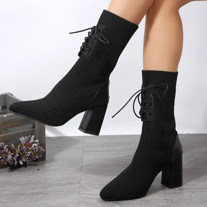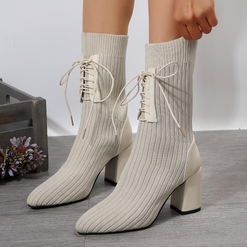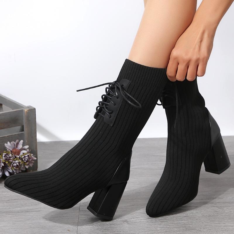 Зимние женские полусапоги 2024 Новые вязаные теплые эластичные тканевые дизайнерские модные ботильоны на высоком каблуке Элегантные женские ботинки с острым носком