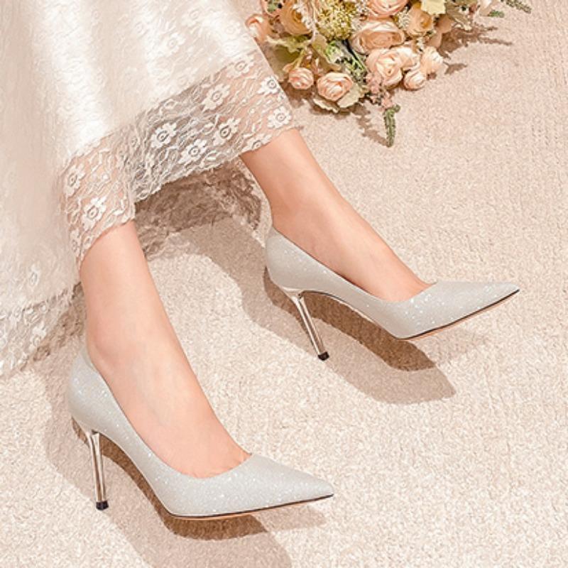 Женские туфли на высоком каблуке, лето 2024, новые блестящие сексуальные остроконечные туфли-шпильки с пайетками, модные однотонные простые туфли без застежек на высоком каблуке 34-49