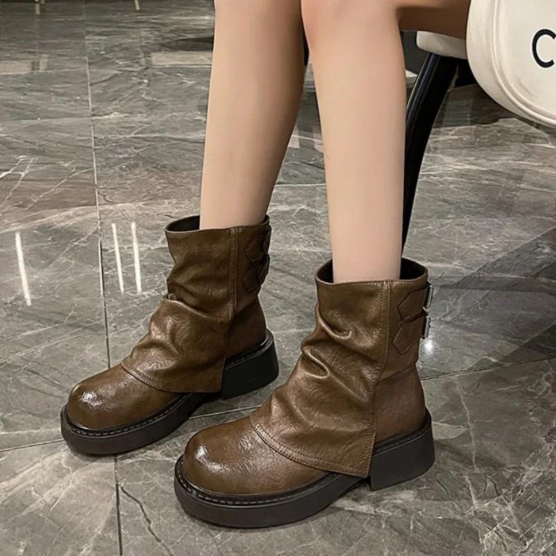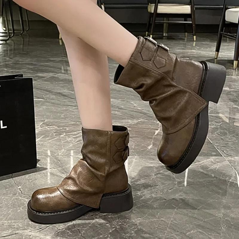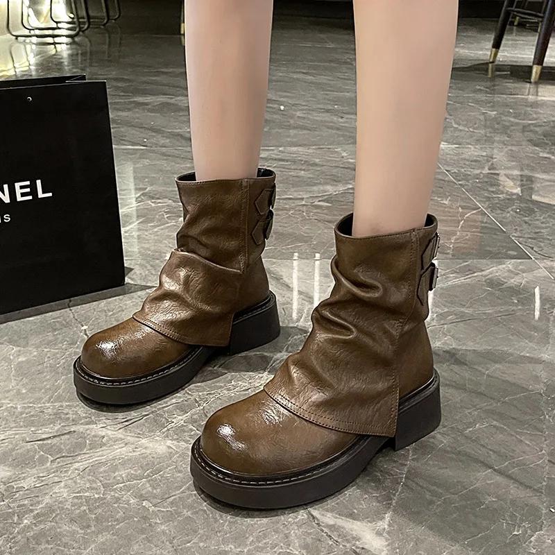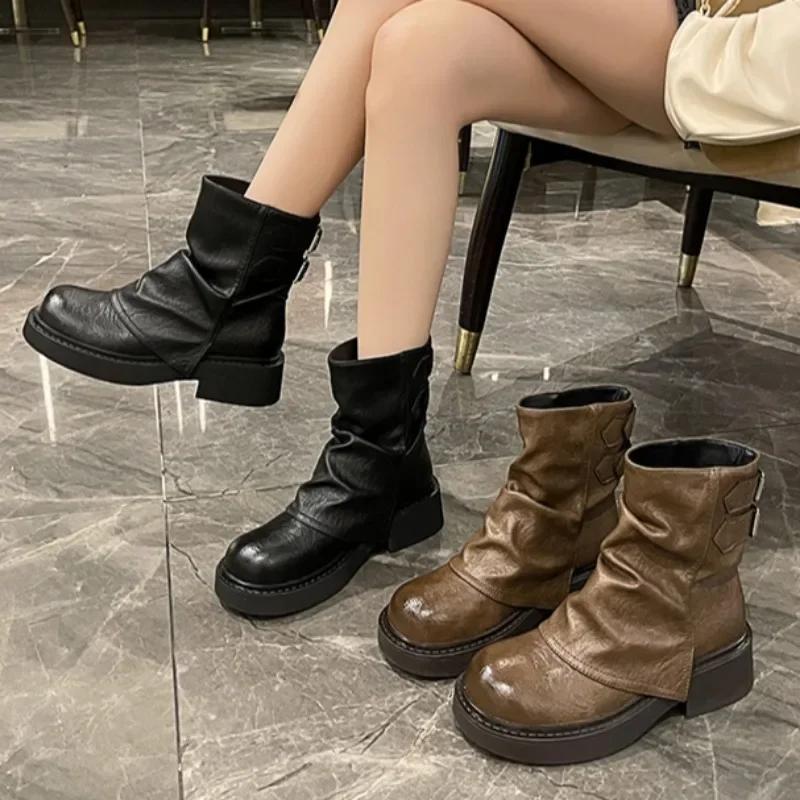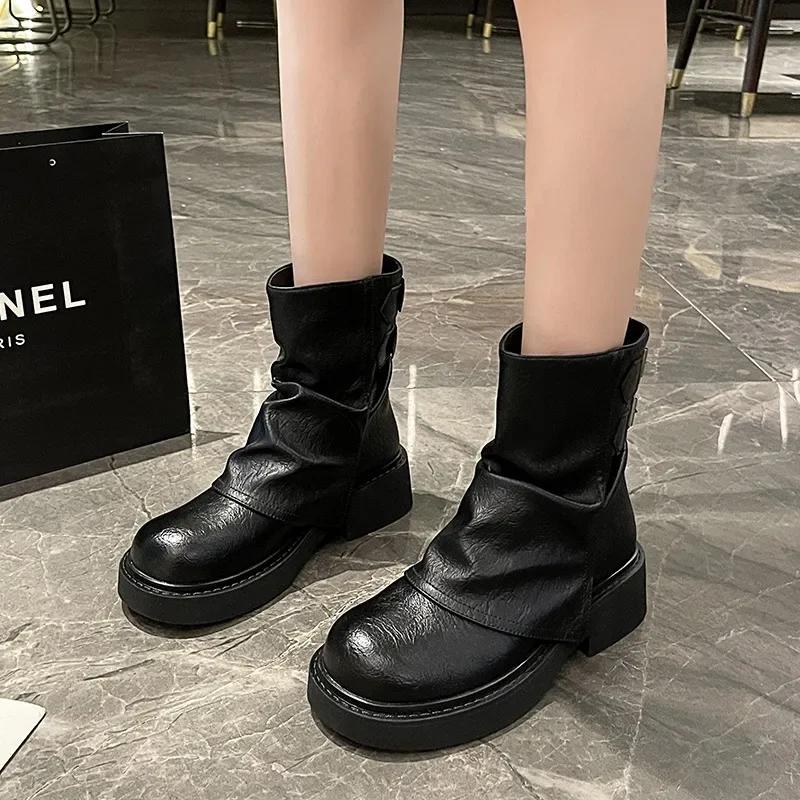 Женские сапоги до середины голени, классические однотонные, в британском стиле, на низком каблуке, мотоциклетные сапоги из искусственной кожи, плиссированные, дизайнерские Botas Femininas