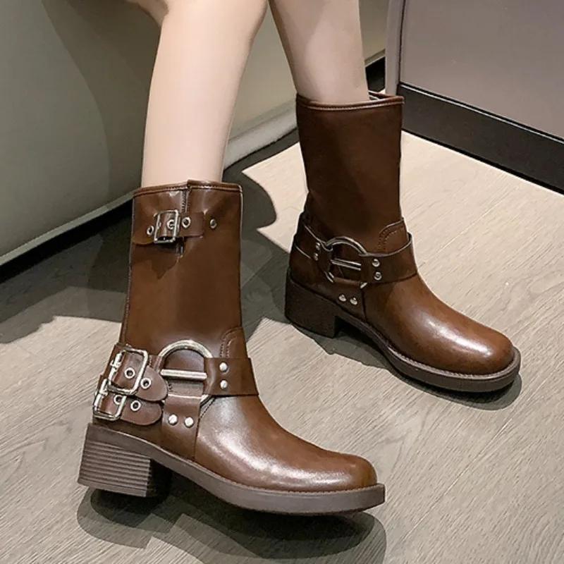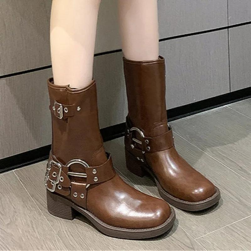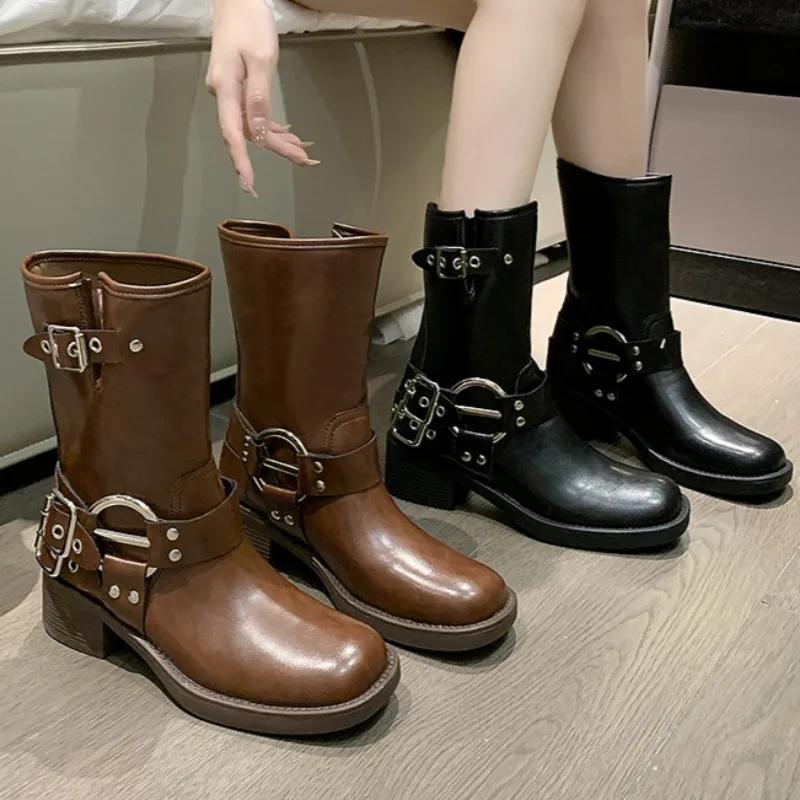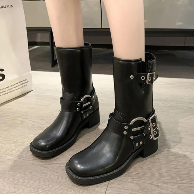 Женские мотоциклетные ботинки с толстой подошвой и толстым каблуком, модные ботинки 2024 года из искусственной кожи с заклепками и металлической пряжкой на ремне, стиль панк, до середины голени