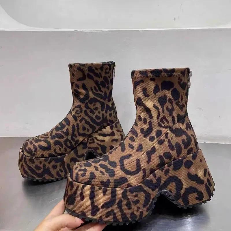 2024 Новые женские ботильоны на высоком каблуке, весна и осень, модный дизайн с молнией, модный леопардовый принт, толстая подошва, женские ботинки