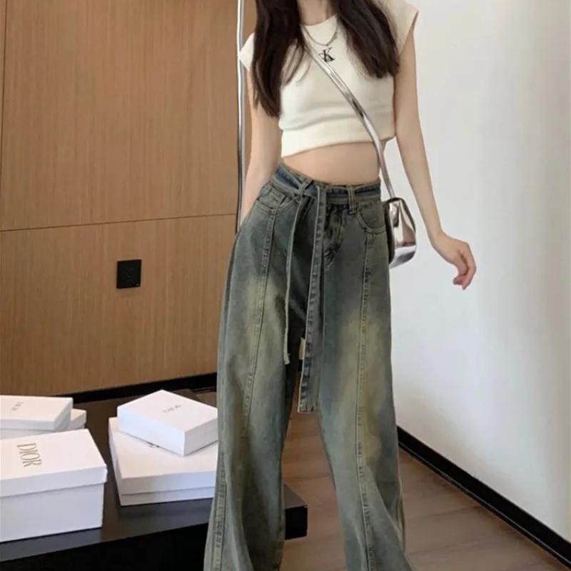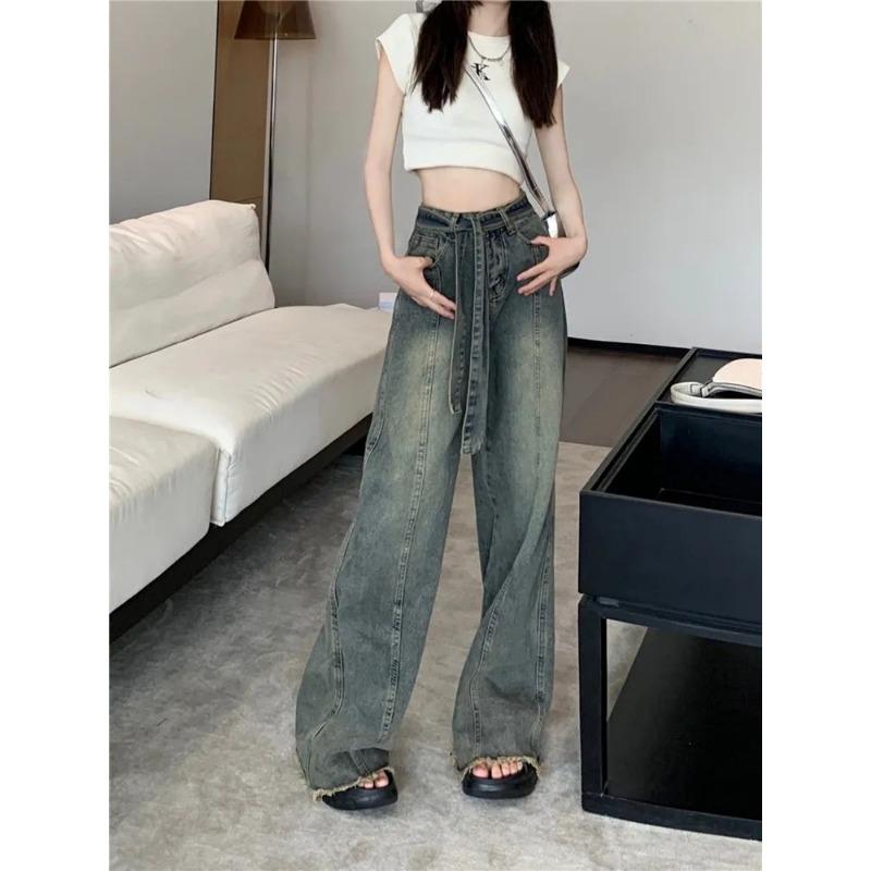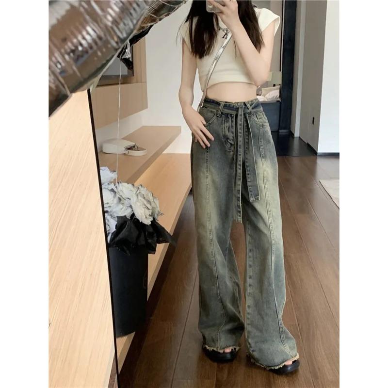 Американские ретро-джинсы с широкими штанинами и бахромой для женщин на лето с нишевым дизайном, высокая талия, свободный крой, утягивающие прямые брюки длиной до пола