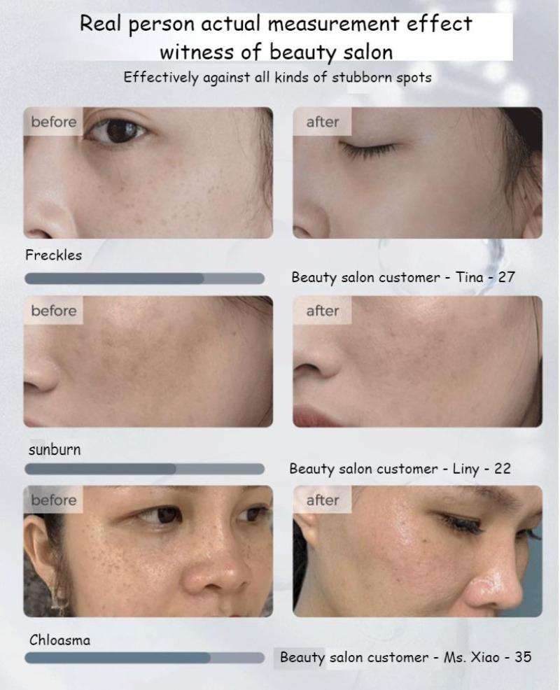 3. Причина образования и глубина пигментации различны, поэтому эффект варьируется от человека к человеку и требует терпения.. Предлагается продлевать использование, когда вы не работаете в короткие сроки, и в то же время, он может достичь хороших результатов за короткое время.. Вы также должны настаивать на его использовании для консолидации.