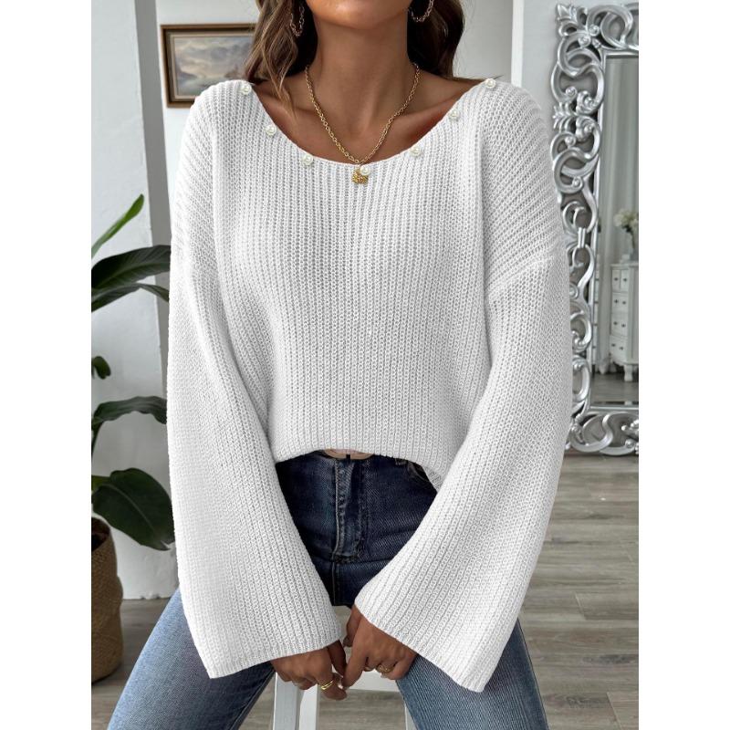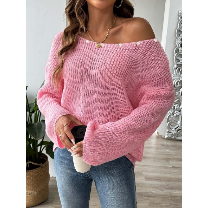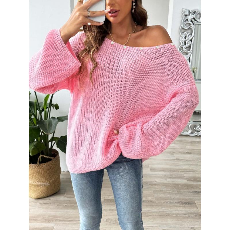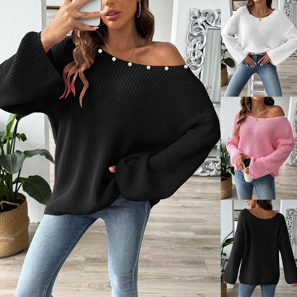 Женский свитер больших размеров с бисером, простой свободный свитер с одним вырезом без бретелек и расклешенными рукавами