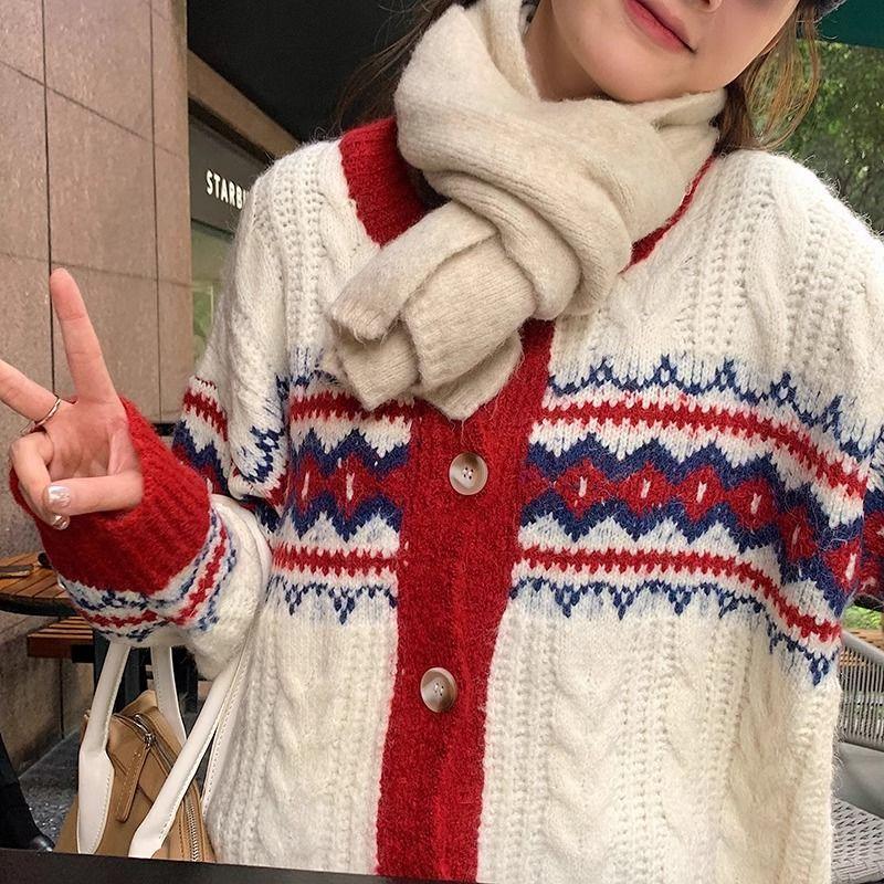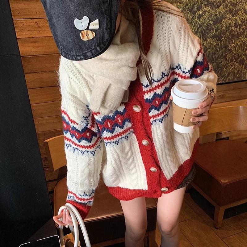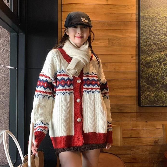 Y2K Милый узор Аргайл Вязаный кардиган для девочек, студентов, свободные свитера большого размера, пальто, зима-осень, топы