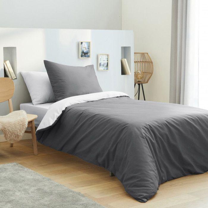 Pack complet 4 pièces Anthracite/Blanc réversible housse de couette pour lit 90 x 190 cm