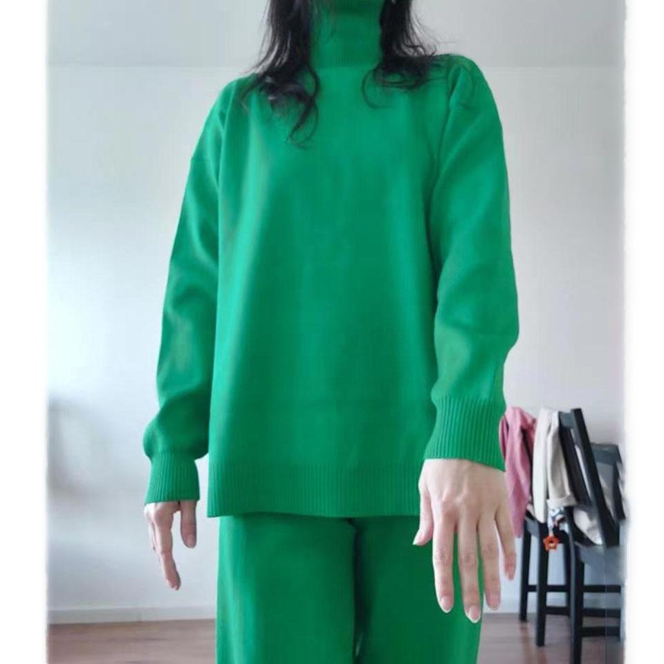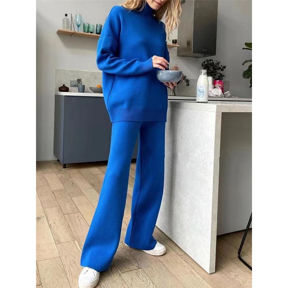 Однотонный трикотажный костюм с высоким воротником для женщин, осенне-зимний шерстяной костюм с широкими штанинами из двух частей