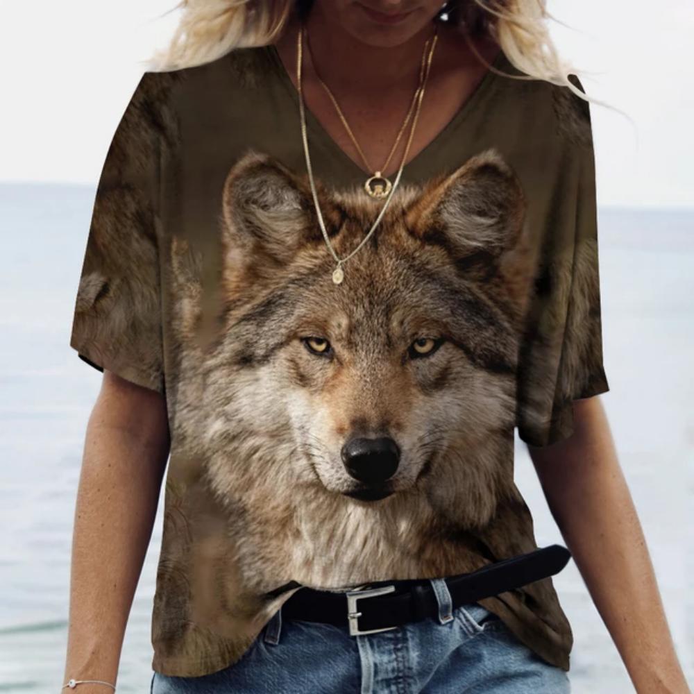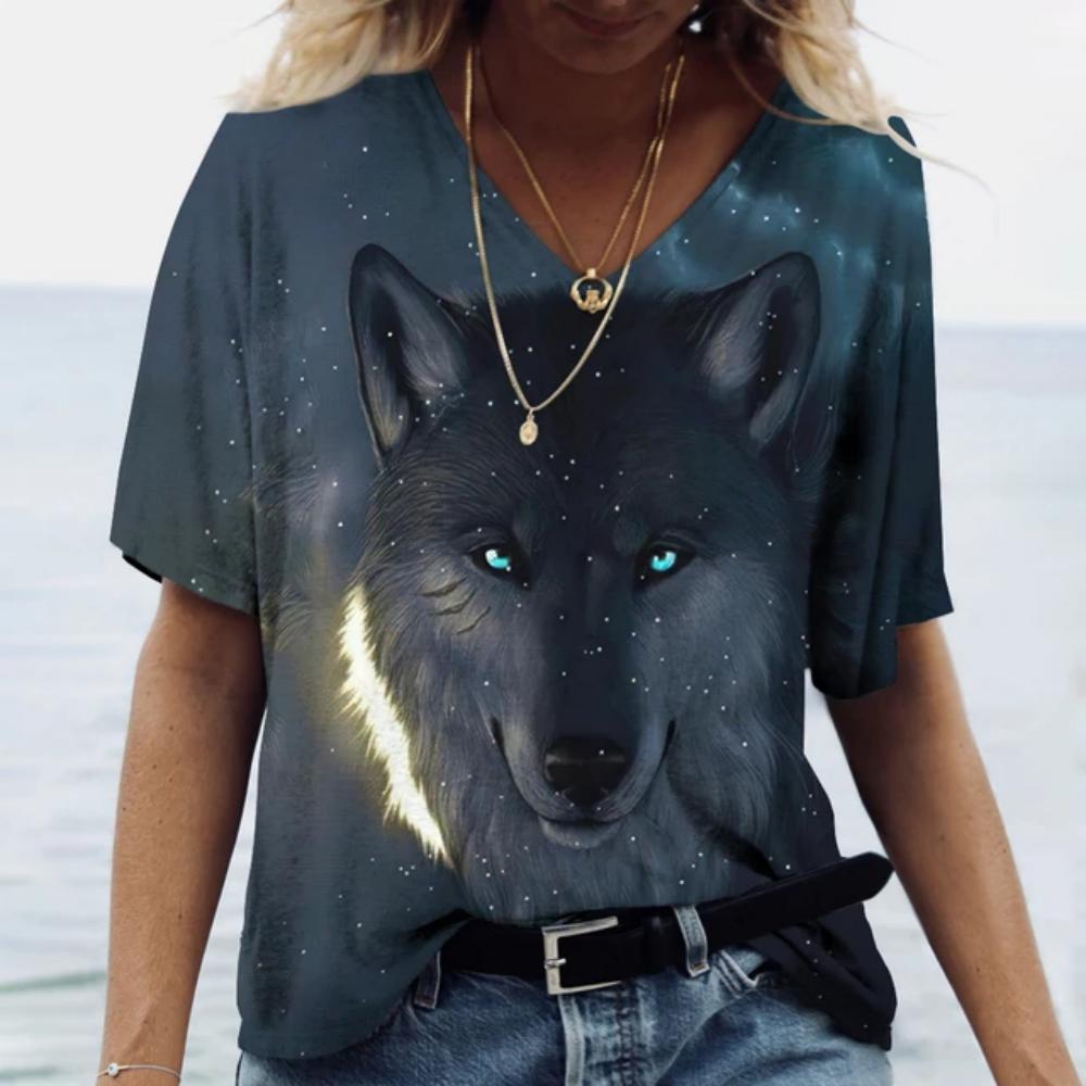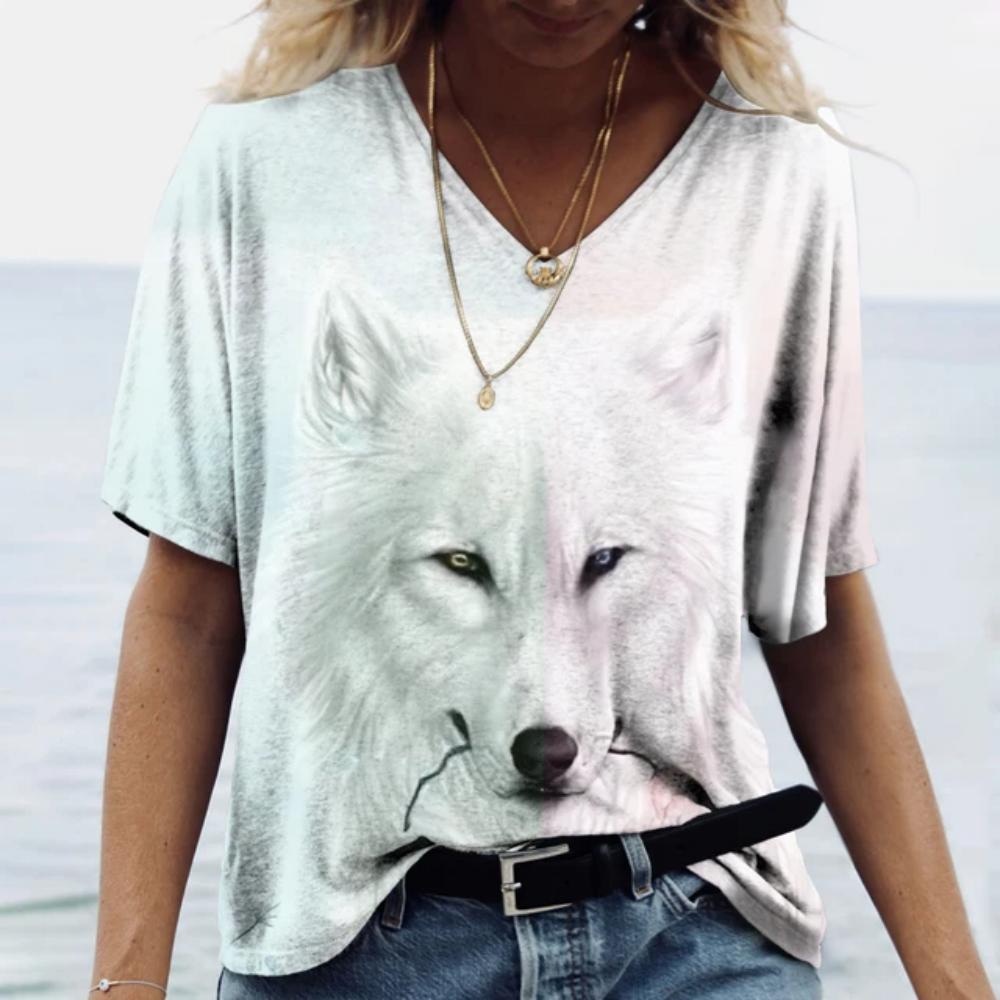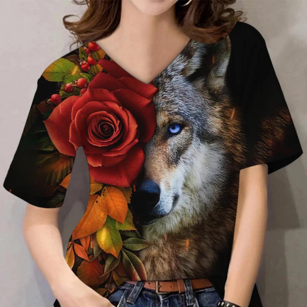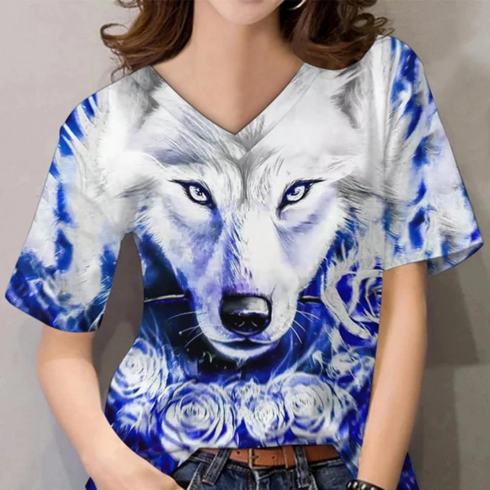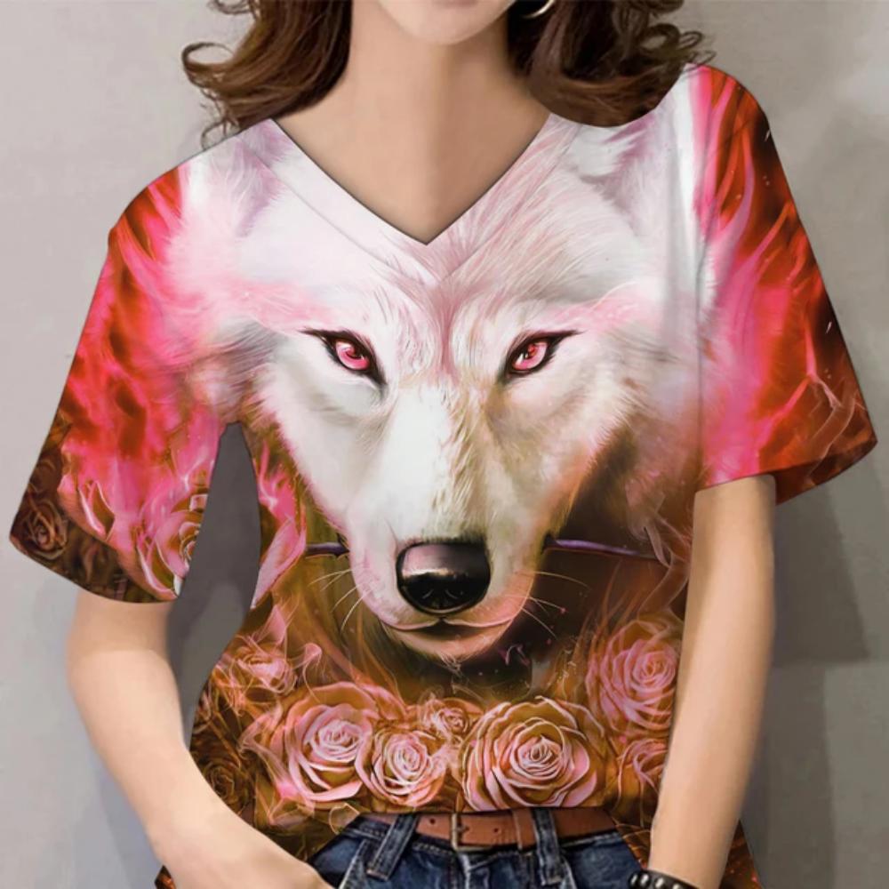 Модная летняя женская рубашка с принтом в виде головы волка в стиле Харадзюку, с V-образным вырезом, большого размера, с короткими рукавами, пляжная женская футболка, уличные топы